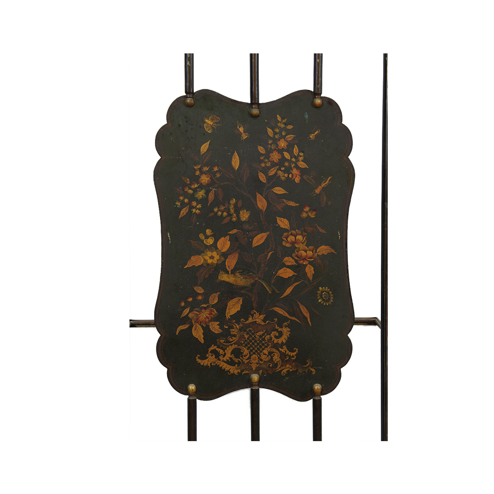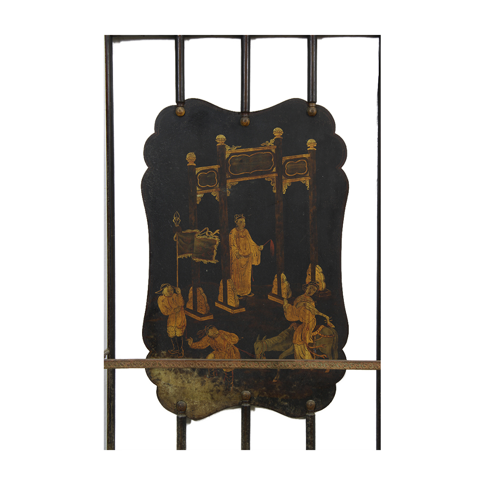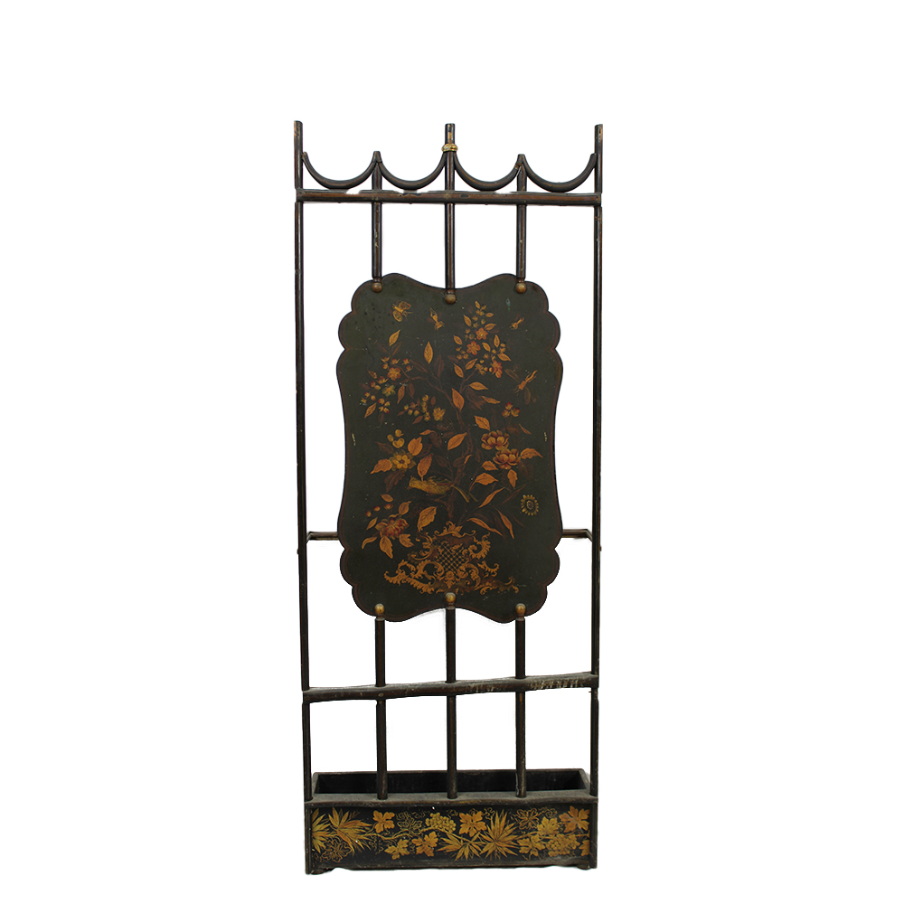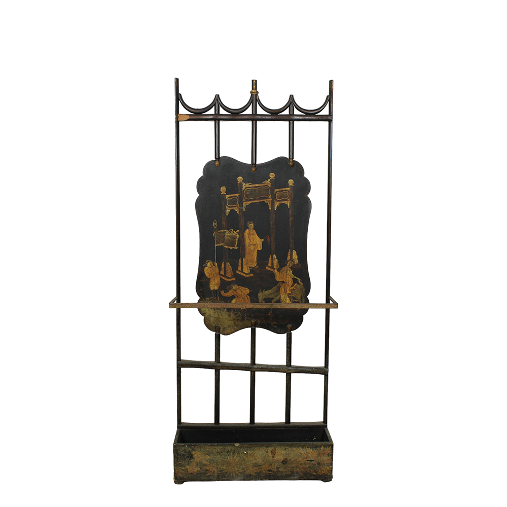 PORTAOMBRELLI in legno ebanizzato e lumeggiature in oro, con pannello in metallo dipinto raffigurante personaggi a motivi orientali, usure del tempo Francia XIX secolo