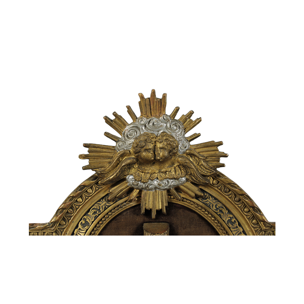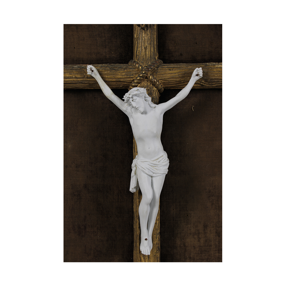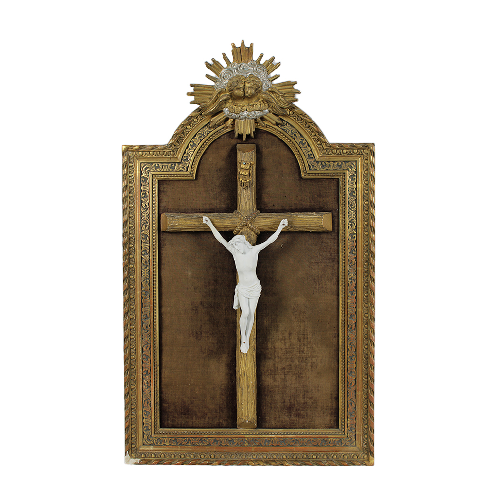 CROCIFISSO in biscuit con croce e cornice in legno e pastiglia dorata, incollaggi ad un braccio maestranze siciliane XIX Secolo h cm 80 x 47