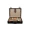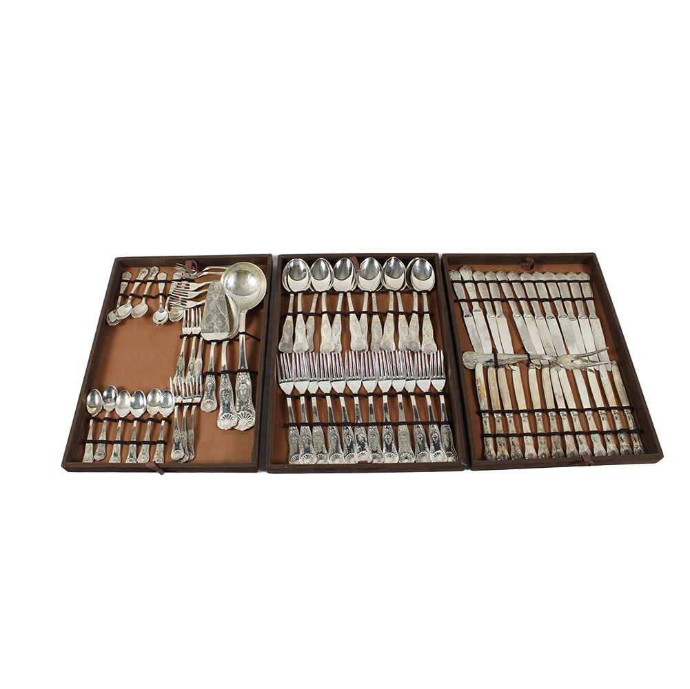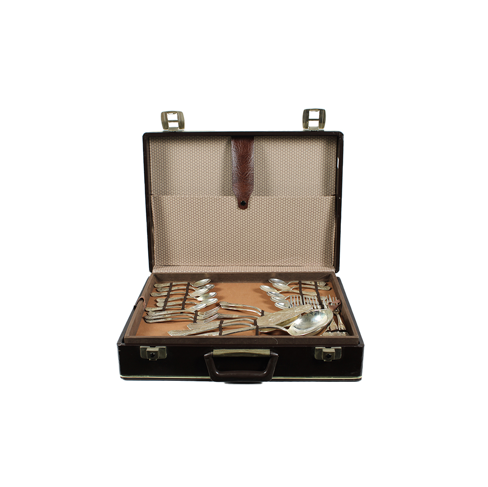 SERVIZIO DI POSATE in metallo argentato per 12 pezzi totali 76 dentro valigia , reca timbro leone con monogramma A.P manifattura italiana XX secolo h cm 33,5 x 44,5 x 11,5