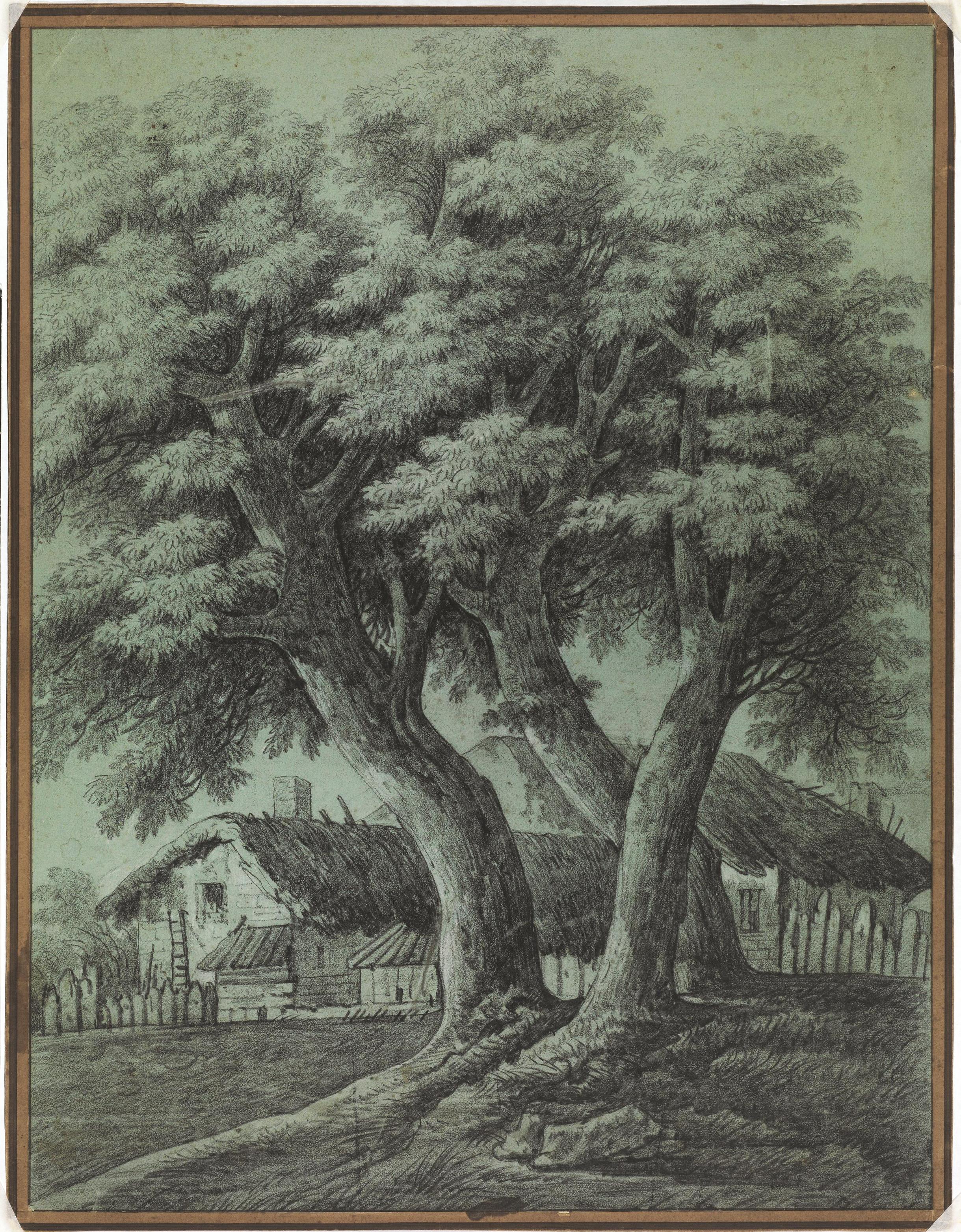 Scuola francese del XVIII secoloPAESAGGIO CON GRANDI ALBERIGessetto nero su...