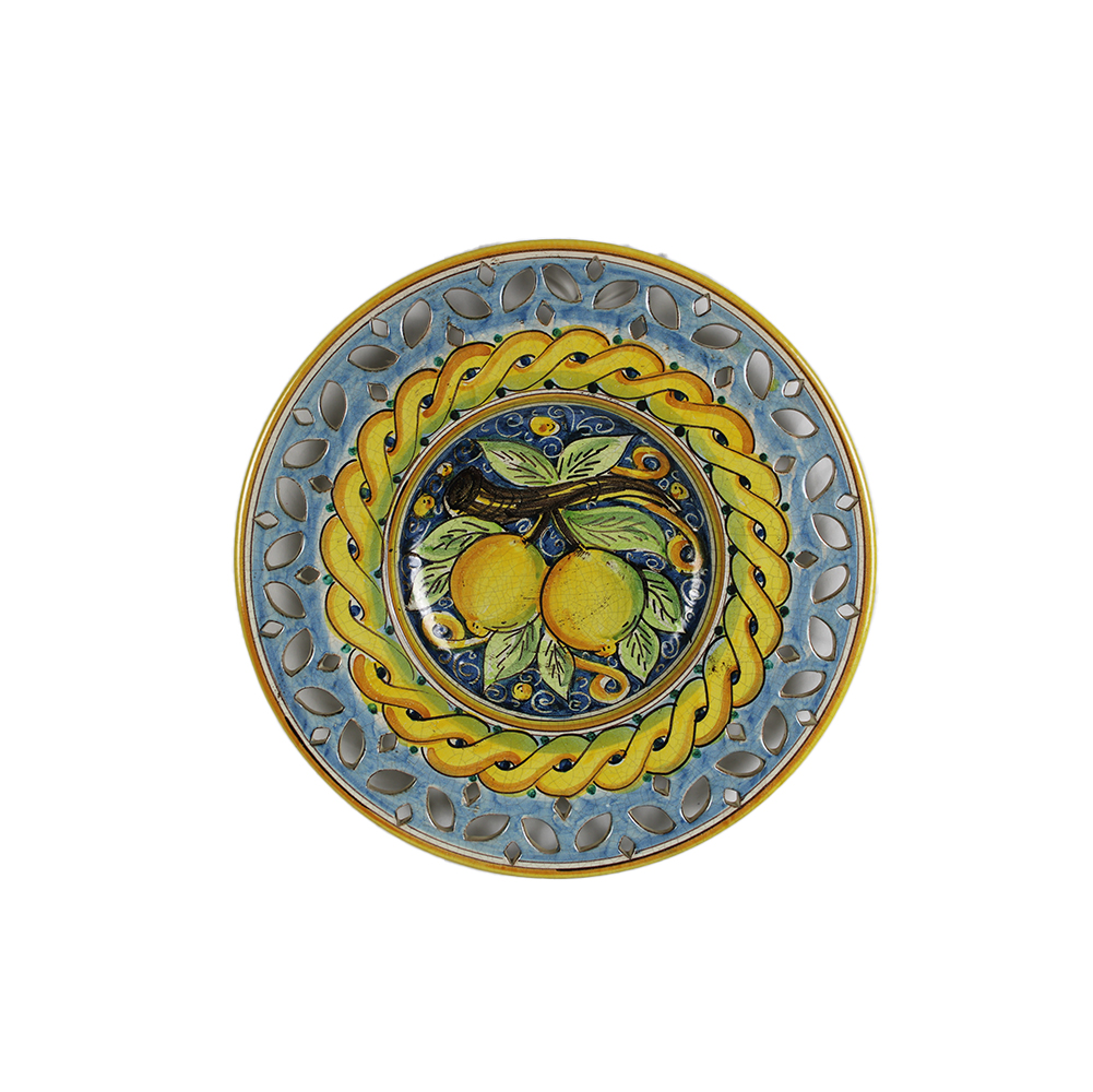PIATTO ISTORIATO DA PARETE in maiolica traforata e dipinta manifattura Boria Caltagirone XX secolo
