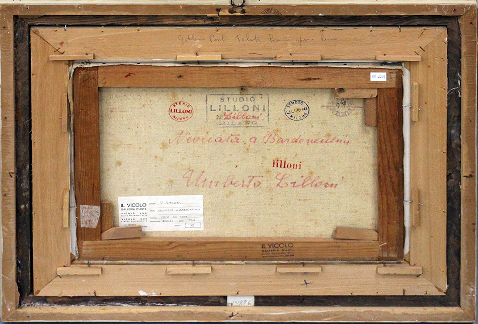 UMBERTO LILLONI, "Nevicata a Bardonecchia", 1952, olio su tela, dim 45x33. Al fronte: firma in basso a destra. Al verso: in alto tre timbri dello "Studio Lilloni, Milano"; al centro titolo e firma; in basso a sinistra etichetta Il Vicolo Galleria d'Arte, Genova: nome autore, titolo, tecnica, dimensioni, anno e N° archiviazione della galleria: 198.