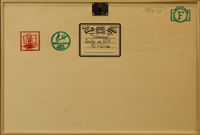 UGO NESPOLO, "Distrazioni", anni 2000, intarsio su tavola, 40x60x3,5 cm, peso 2 kg, opera archiviata dallo Studio Nespolo. Al fronte: firma in basso a destra. Al verso: titolo, tecnica, misure, timbro della Casa d'Arte Nespolo, 3 timbri. Opera con certificato di provenienza della Daliano Ribani Arte. L'opera non necessita cornice.
