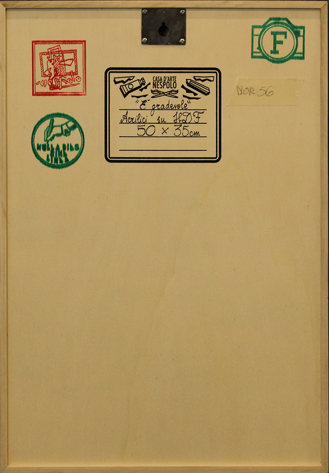 UGO NESPOLO, "E' gradevole", anni 2000, intarsio su tavola, 50x35x3,5 cm, peso 1,5 kg, opera archiviata dallo Studio Nespolo. Al fronte: firma in basso a destra. Al verso: titolo, tecnica, misure, timbro della Casa d'Arte Nespolo, 3 timbri. Opera con certificato di provenienza della Daliano Ribani Arte. L'opera non necessita cornice.
