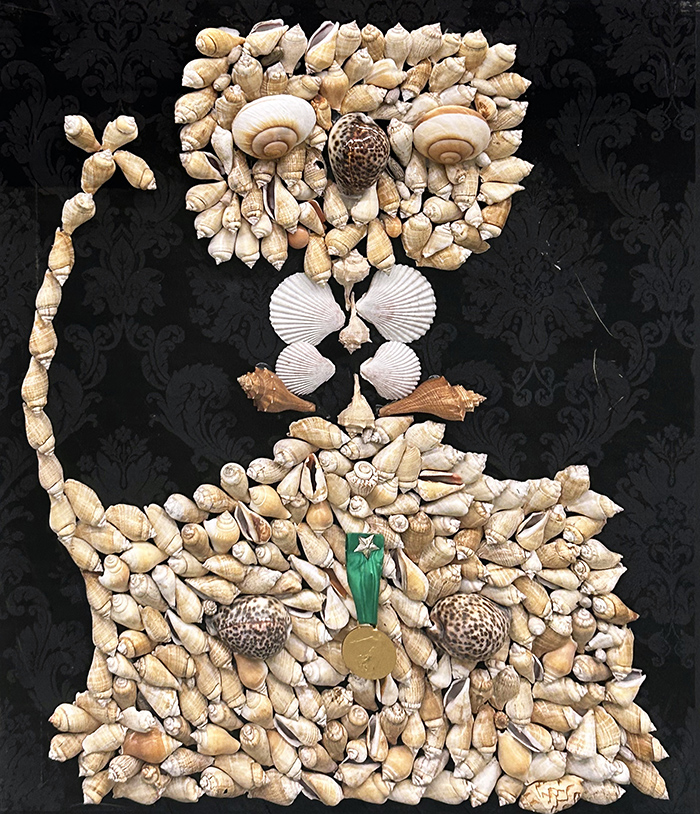 ENRICO BAJ, "Catherine henriette de balzac d'entragues marquise de vernevil maitresse de henri IV", 1878, multiplo con medaglia realizzato con conchiglie su damasco in quattro versioni di colori differenti (nero, verde, rosso, bianco), dim 80x70 cm. Presenta firma dell'autore sul retro della medaglia