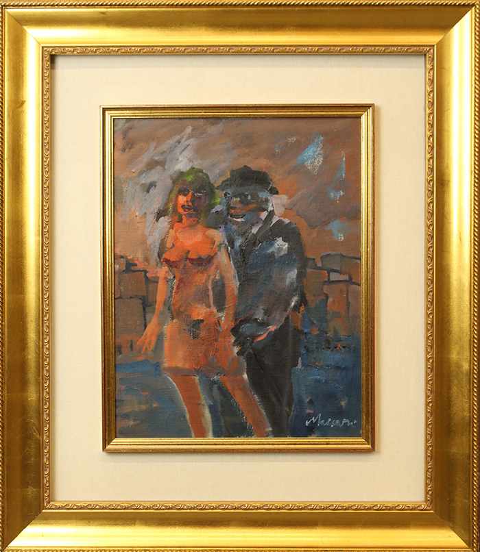 MINO MACCARI, "L'Approccio", 1968, olio su tela cartonata, cm 35x45, con cornice 76x66x5 cm, peso 3,50 kg, opera pubblicata sul Volume "Maccari alla Tavolozza" a cura di Leonardo Sciascia, edizioni Galleria "La Tavolozza" Palermo. Al fronte: firma in basso a destra. Al verso: etichetta Galleria "La Tavolozza" Palermo in basso e timbri, titolo al centro. Opera con certificato di provenienza della Daliano Ribani Arte.