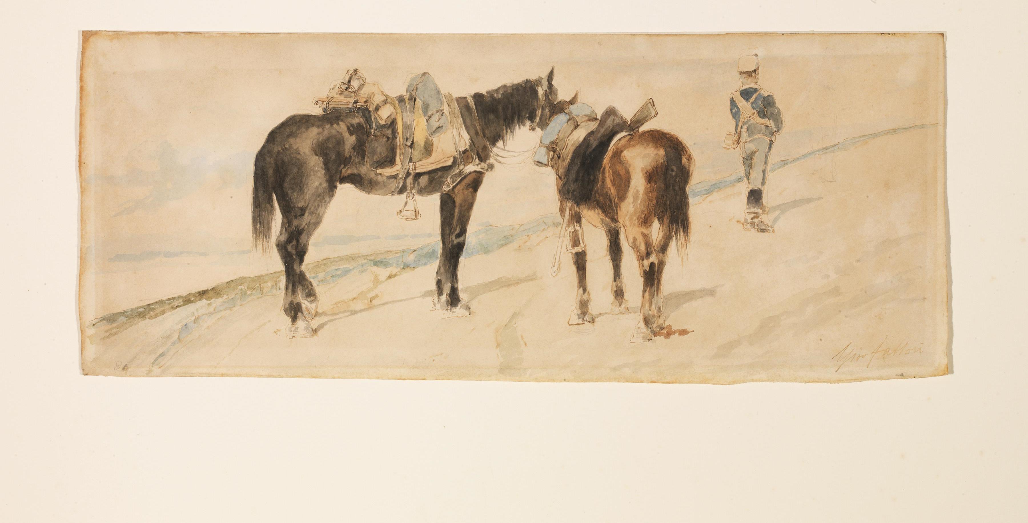 Foglio di grande freschezza nel segno e nel colore: composto entro un sapiente impianto orizzontale tipico di una certa narrazione quasi cinematografica di Giovanni Fattori. La figura dell’artigliere è replicata in posizione più avanzata in un leggero pentimento a matita, rivelatore di una matura e ragionata progettazione compositiva. L’acquerello, che solo in certe parti è riempitivo coloristico delle aree grafiche, è prevalentemente utilizzato in senso pittorico alla ricerca dei valori tonali e di chiaroscuro specialmente nella resa della muscolatura dei cavalli e dei rapporti di luce sul loro manto.