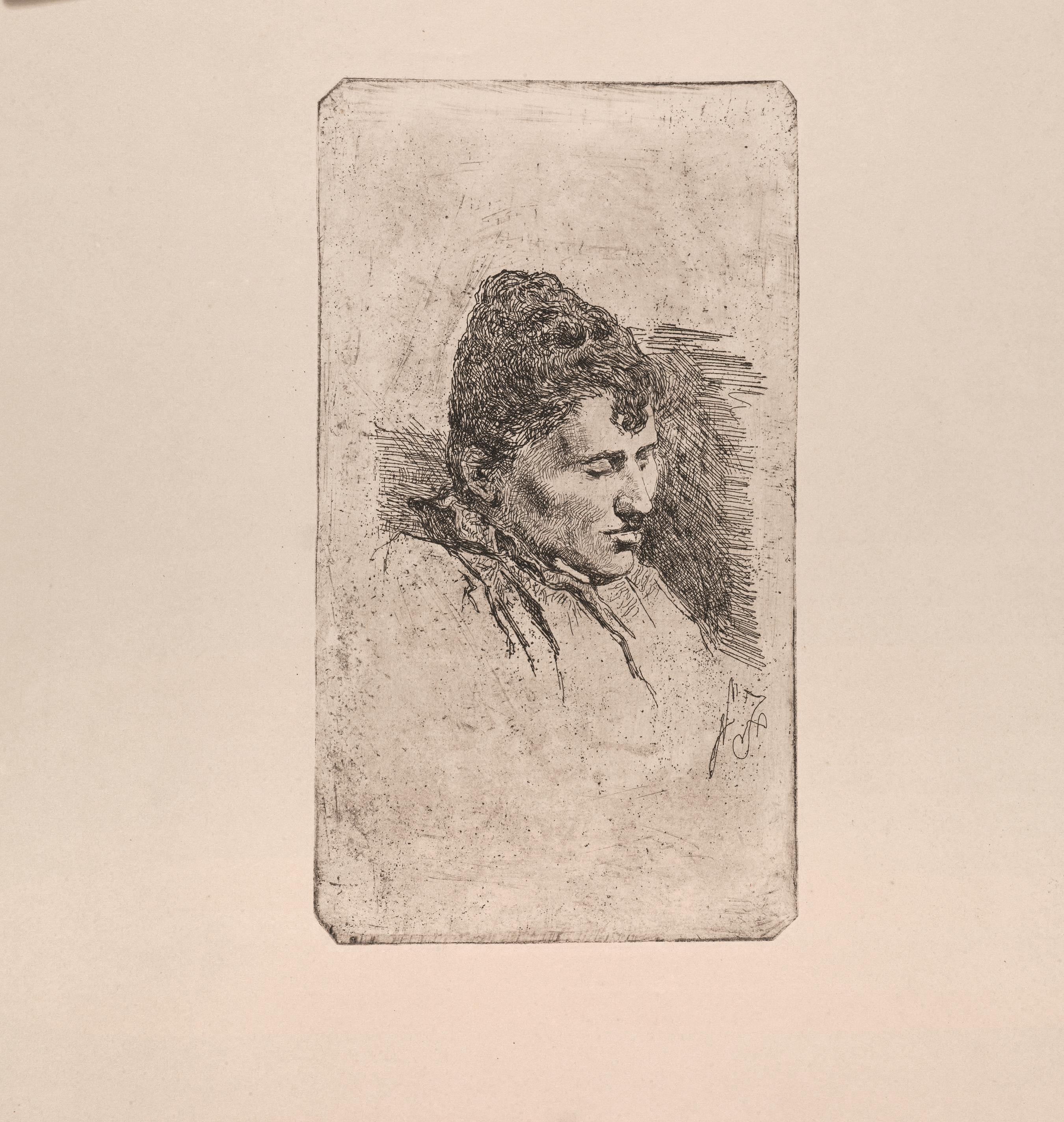Monogrammata sulla lastra in basso a destra. Ritratto di Marianna Bigazzi seconda moglie dell’artista morta nel 1903. Un esemplare in proprietà eredi Malesci reca iscrizione autografa con la data “1903” che la Bonagura interpreta come data di esecuzione della lastra, già datata al 1883 da Dario Durbè. Stato unico. Lastra conservata presso il Gabinetto Disegni e Stampe degli Uffizi (Inv. 2M).