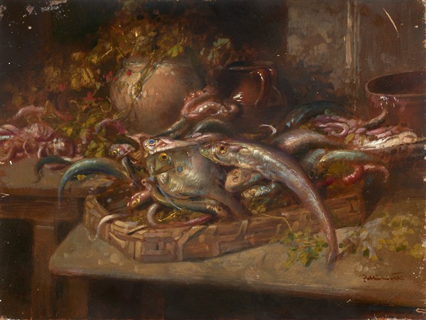 Tito Pellicciotti "Composizione con pesci" olio su compensato (cm 22,5x30,5) Fi