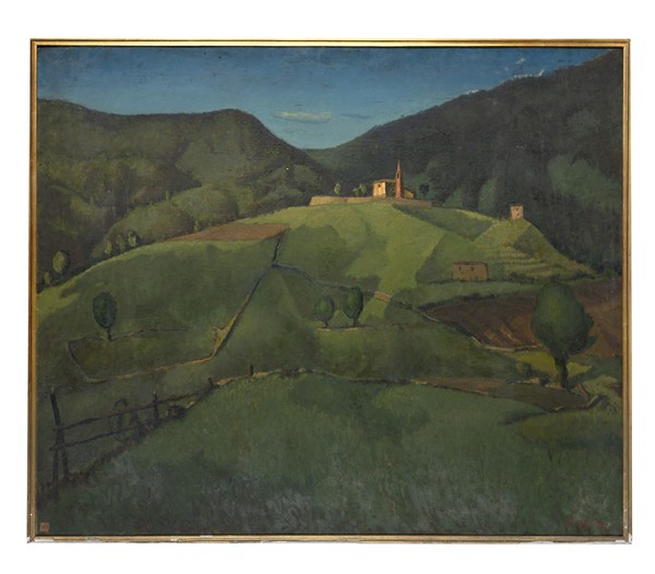 Luigi Zago "Chiesetta sul colle" olio su compensato (cm 100x120)Firmato in bas