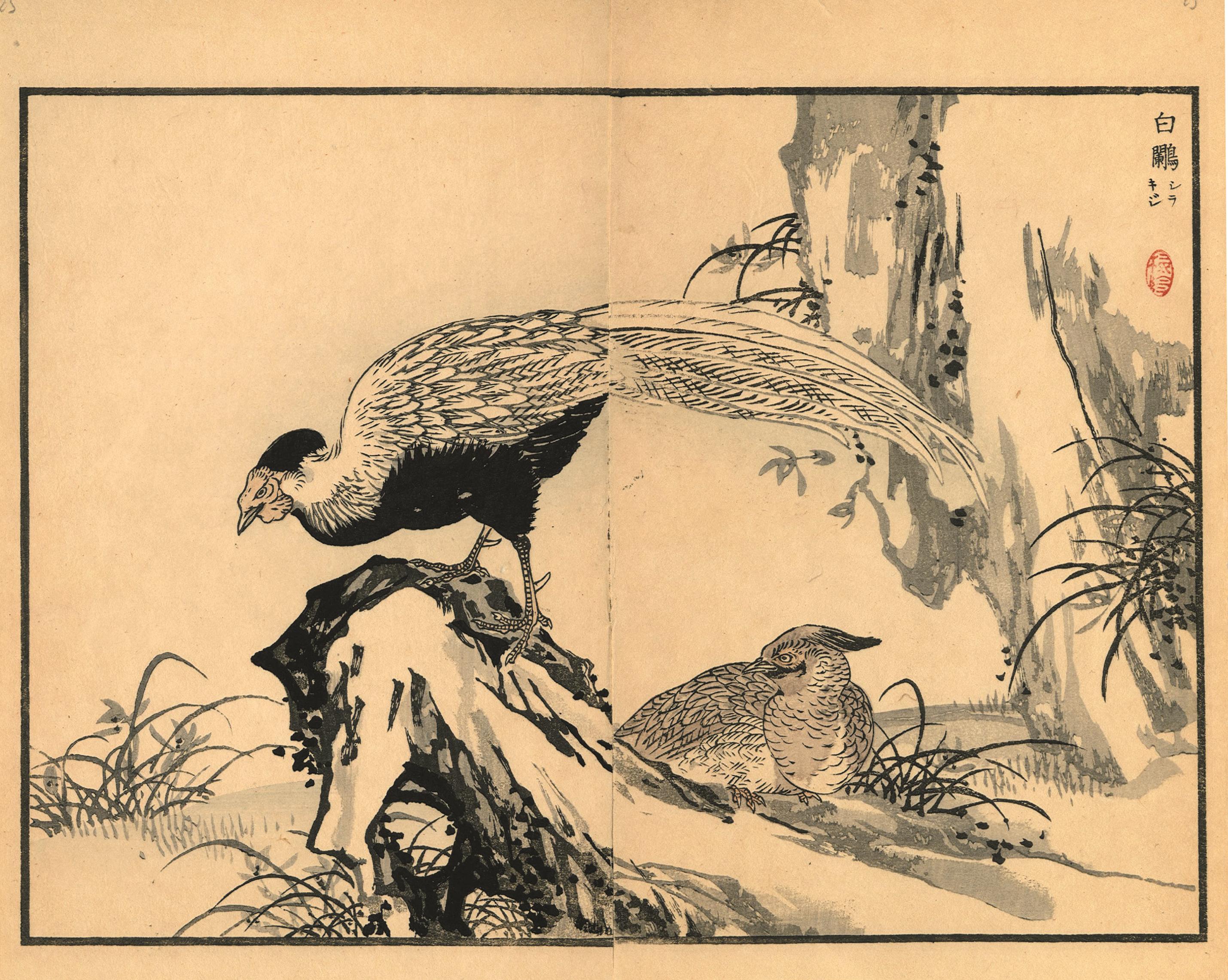 24 xilografie policrome (nishiki-e), 13 tavole doppie (mm 250x305 ciascuna) ed 11 tavole singole (mm 250x165 ciascuna), tratte da Bairei Hyakucho Gafu (Album di Bairei di 100 uccelli) serie pubblicata in volumi a Kyoto nel 1881 da Okura Magobei.