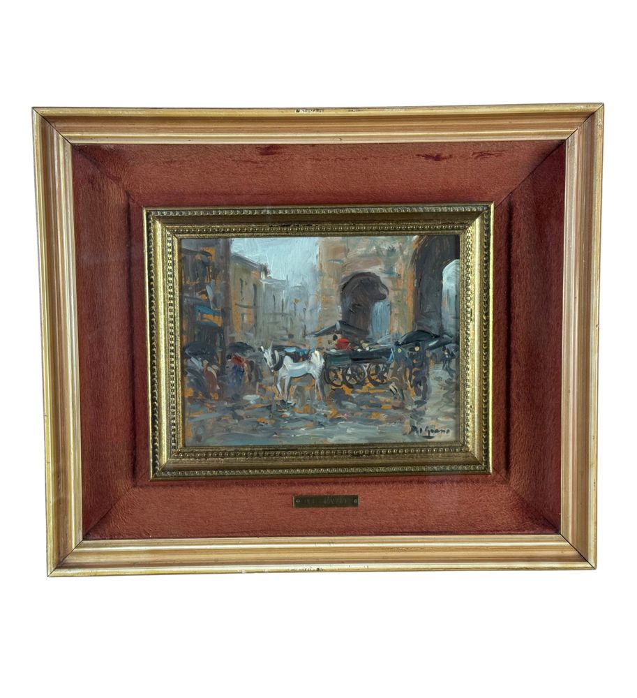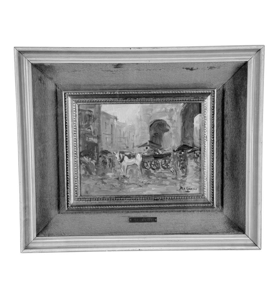 Dipinto olio su pannello, periodo XX secolo scuola Italiana, raffigurante Stradina con personaggi. Dimensioni compreso cornice: 44x37 cm. Dimensioni interno cornice: 24x18 cm. Reca firma in basso a destra Del Grasso. Opera in buone condizioni.