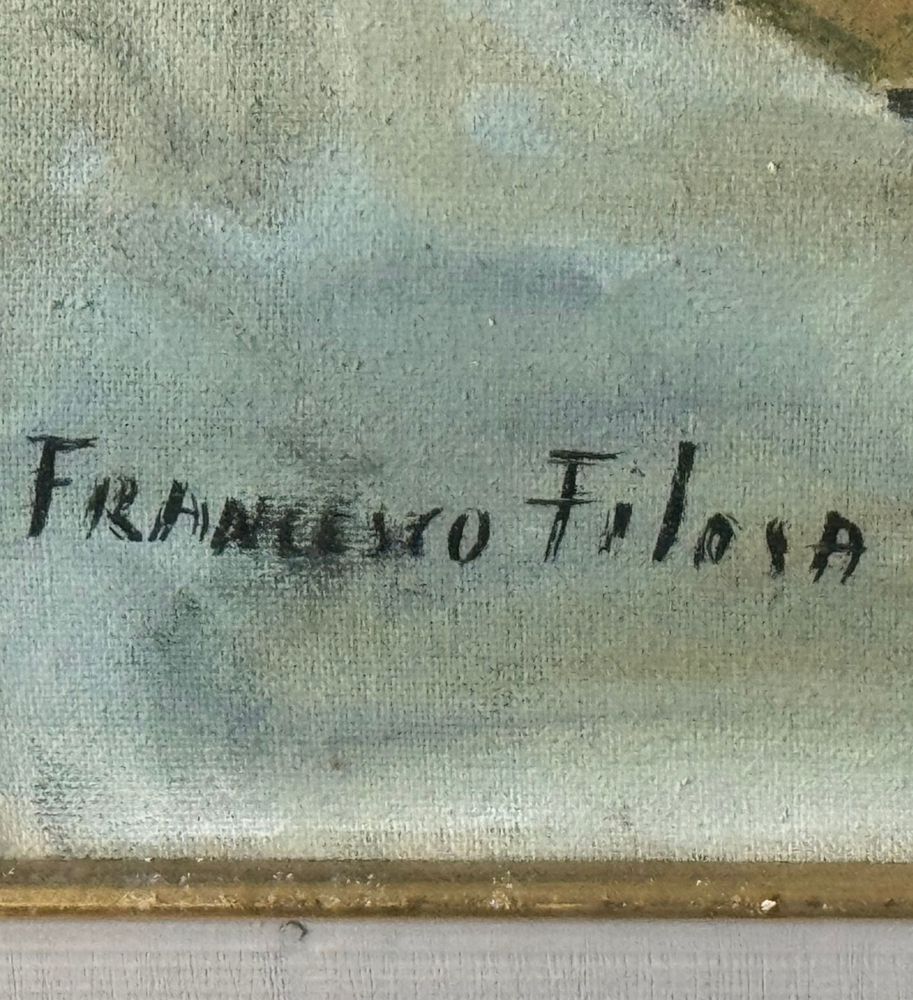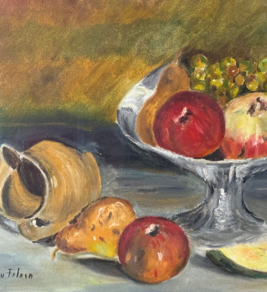 Dipinto olio su tela, periodo XX secolo scuola Italiana, raffigurante Natura morta. Dimensioni compreso cornice: 64x51 cm. Dimensioni interno cornice: 55x41 cm. Reca firma in basso a sinistra Francesco Filosa. Opera in buone condizioni.