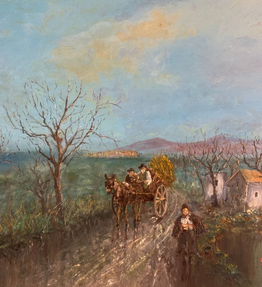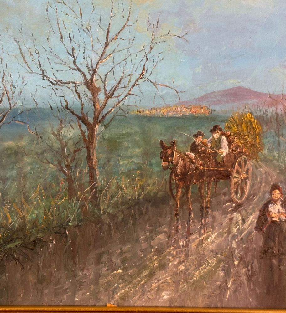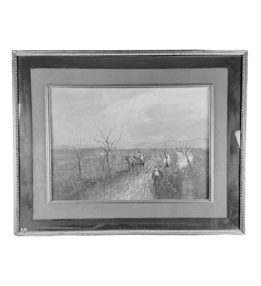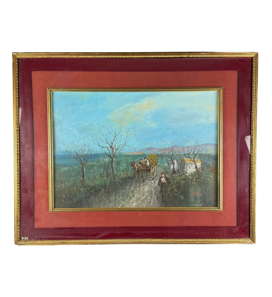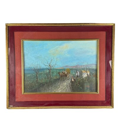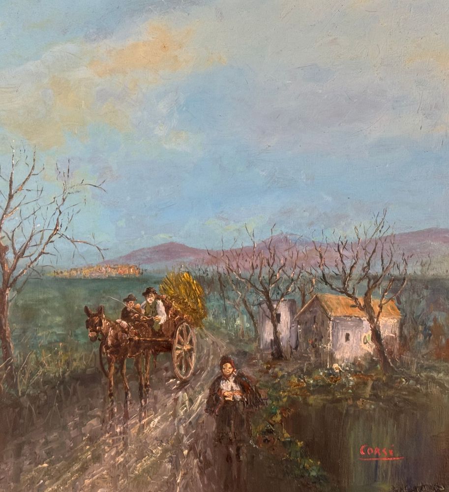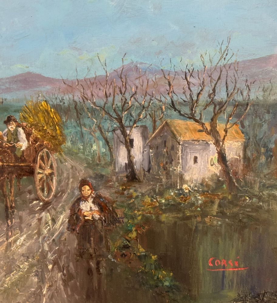 Dipinto olio su tavola, periodo XX secolo scuola Italiana, raffigurante Strada di campagna con personaggi. Dimensioni compreso cornice: 99x78 cm. Dimensioni interno cornice: 70x50 cm. Reca firma in basso a destra Corsi. Opera in buone condizioni.