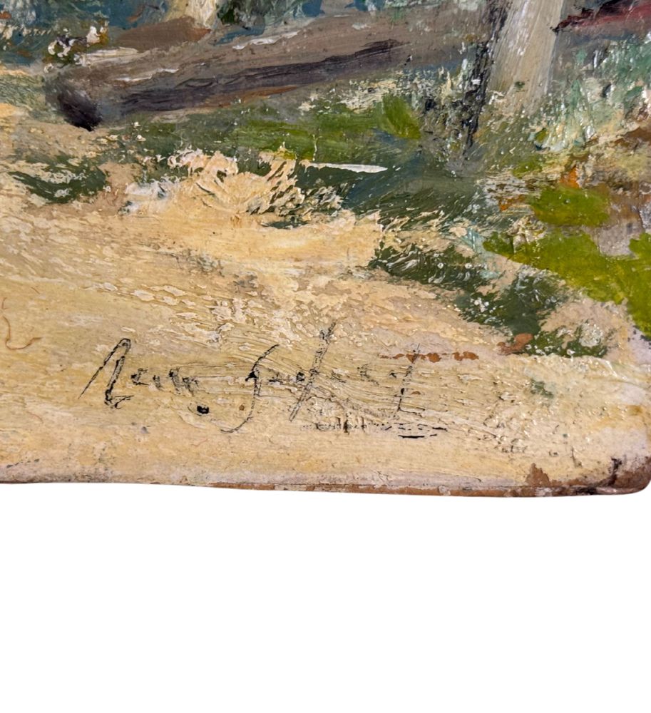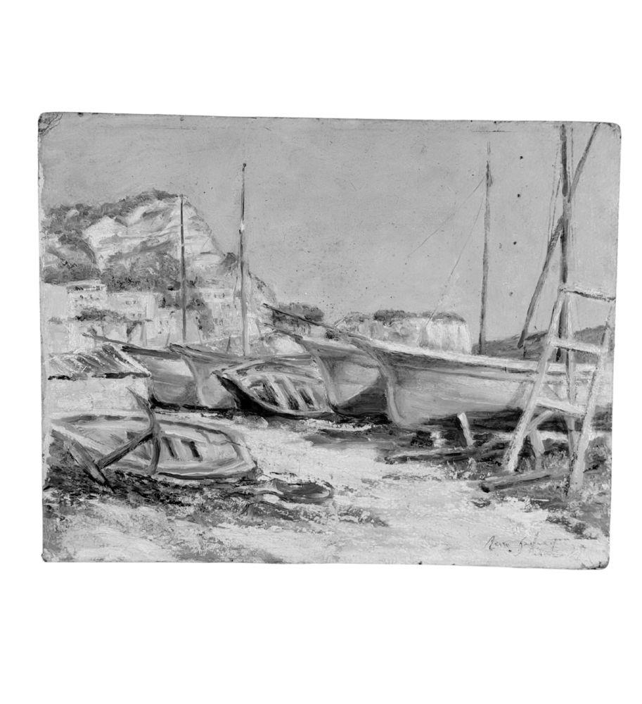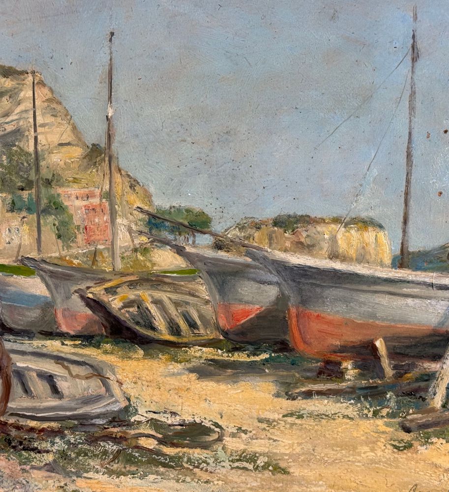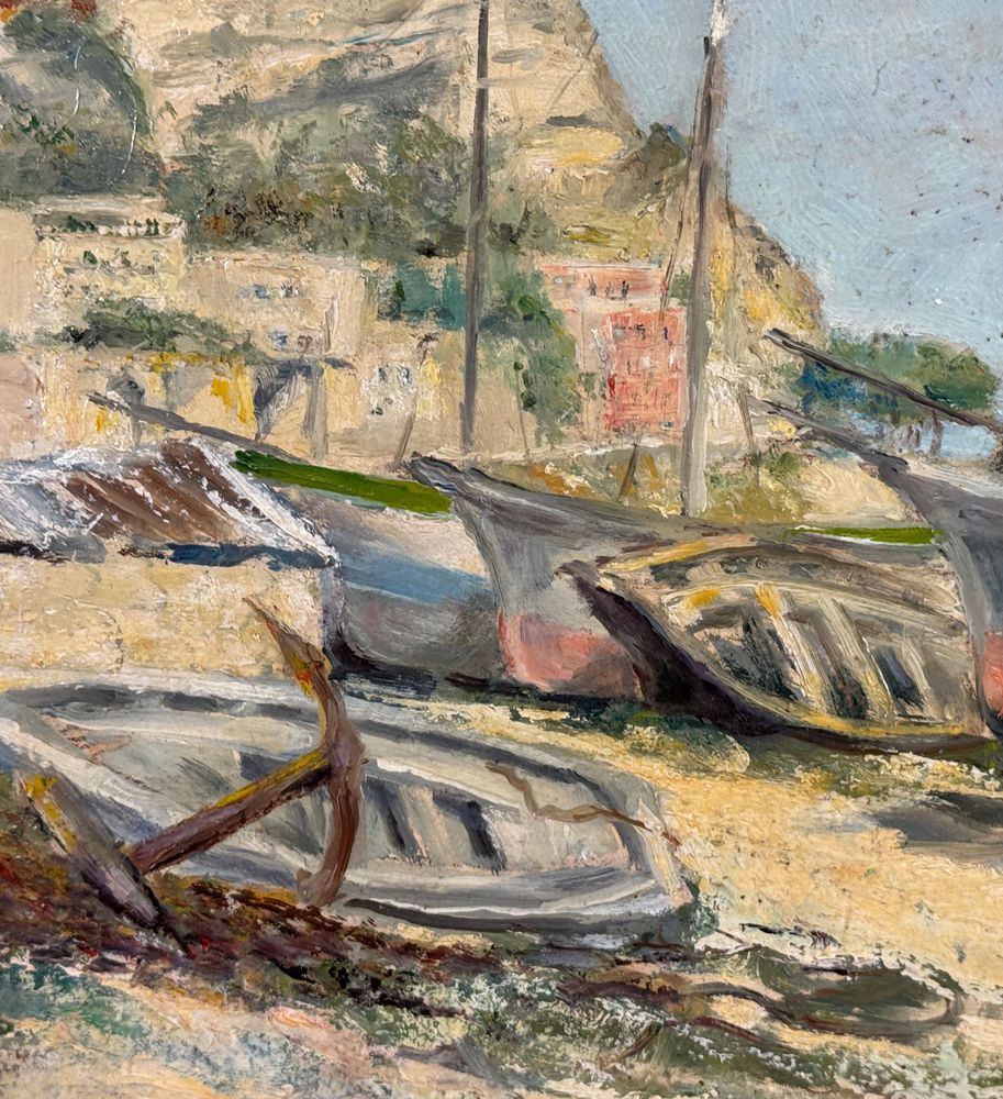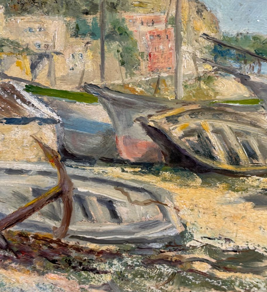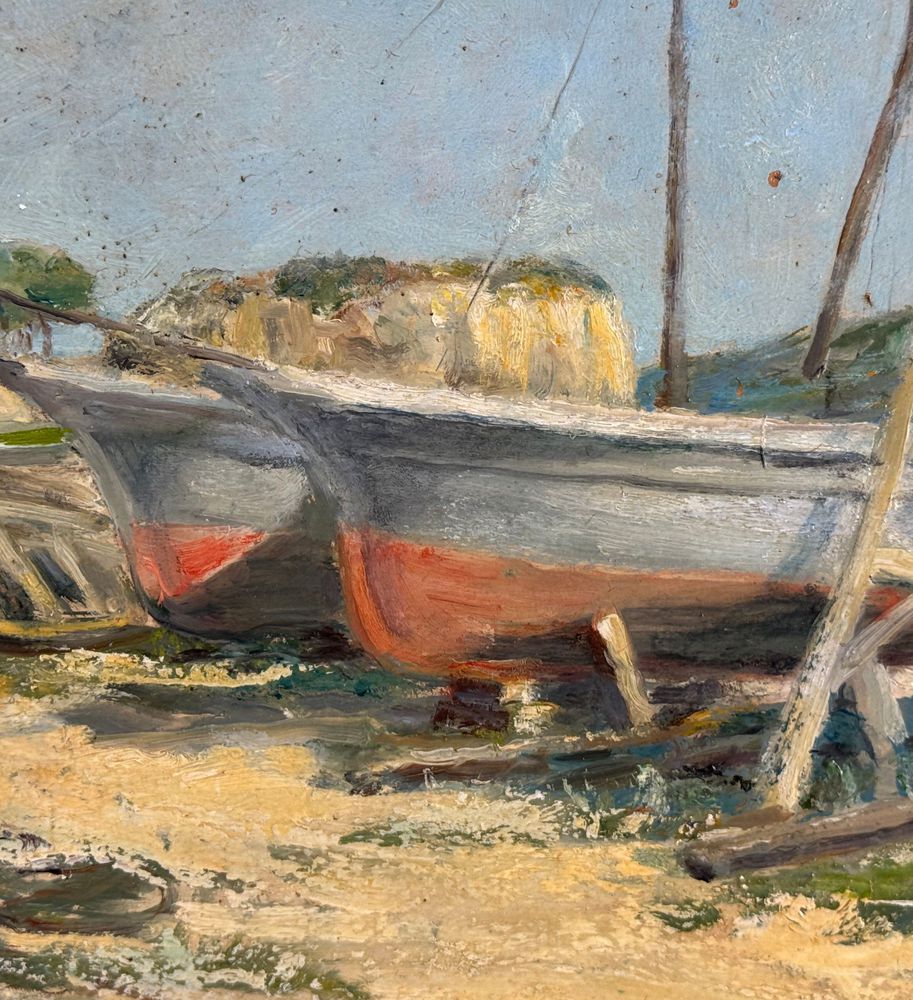 Dipinto olio su cartoncino, periodo XX secolo scuola Italiana, raffigurante Scorcio di marina con barche a secco. Dimensioni: 38x30 cm. Reca firma in basso a destra da artista non identificato. Opera in buone condizioni con lievi segni di vissuto come da foto allegate.