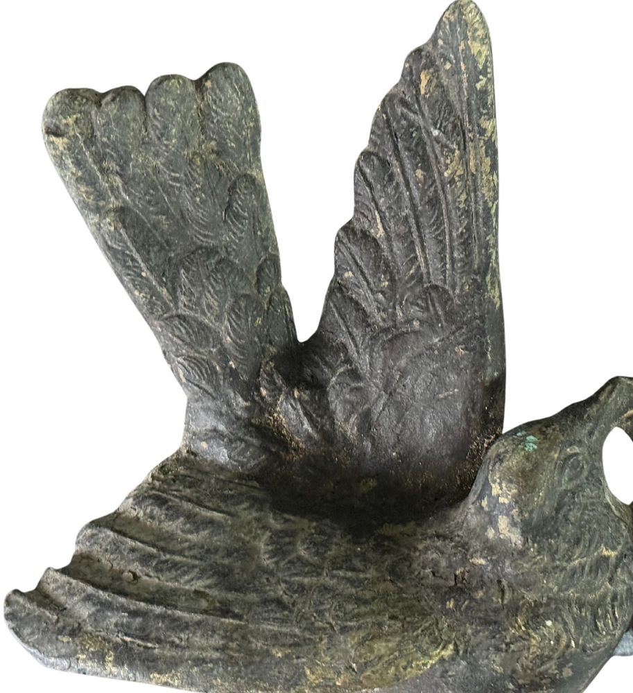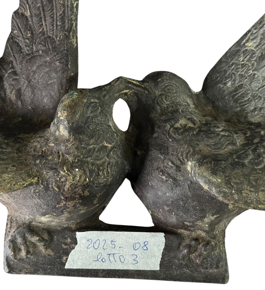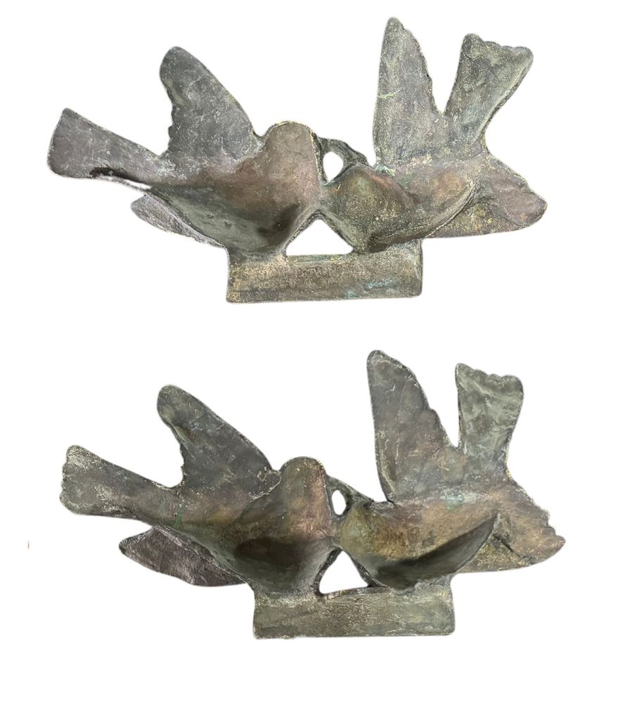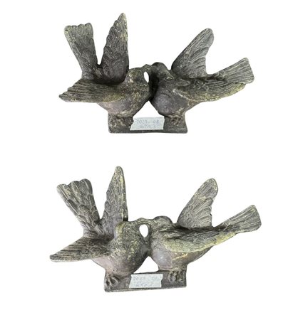 Coppia di sculture in bronzo a cera persa, raffiguranti Uccelli in amore. Dimensioni cadauno: 40xH25x8 cm. Sculture in buone condizioni.