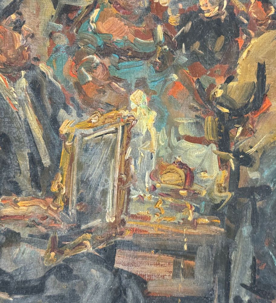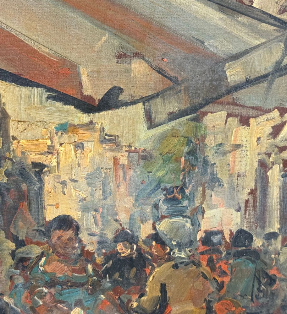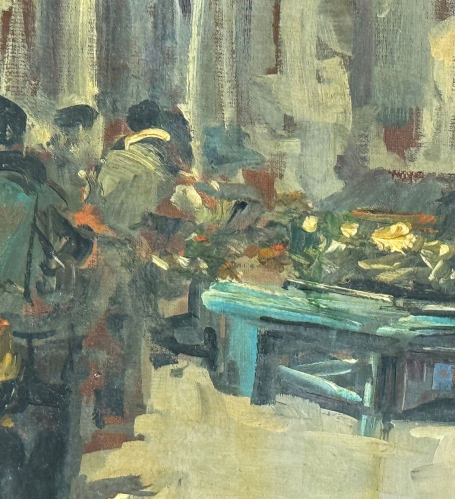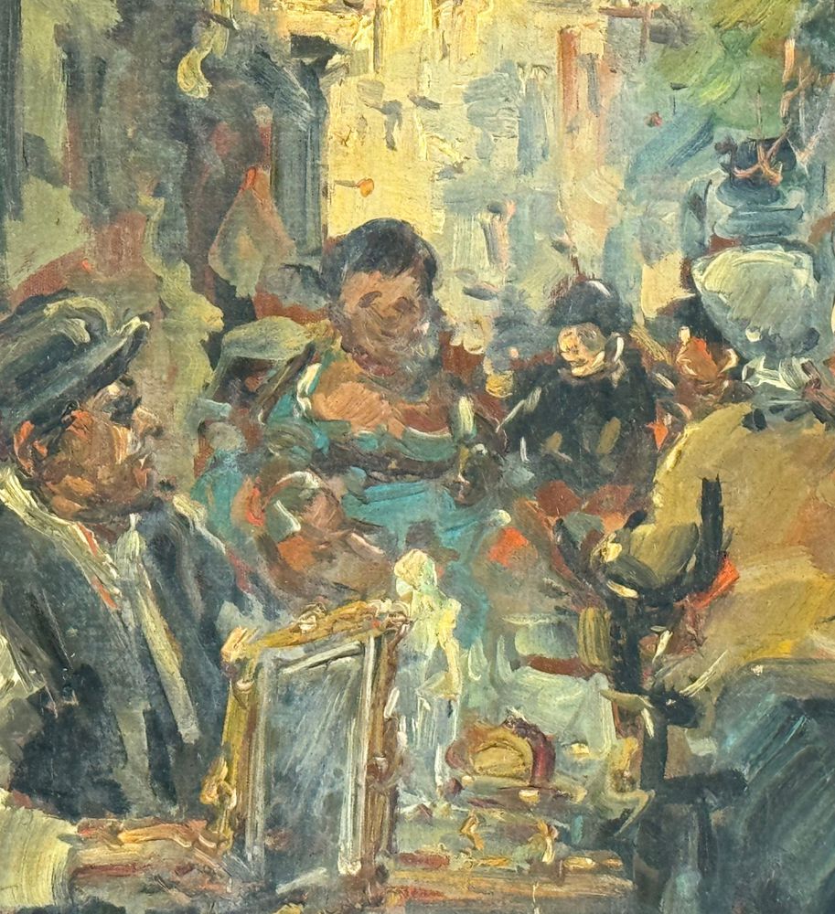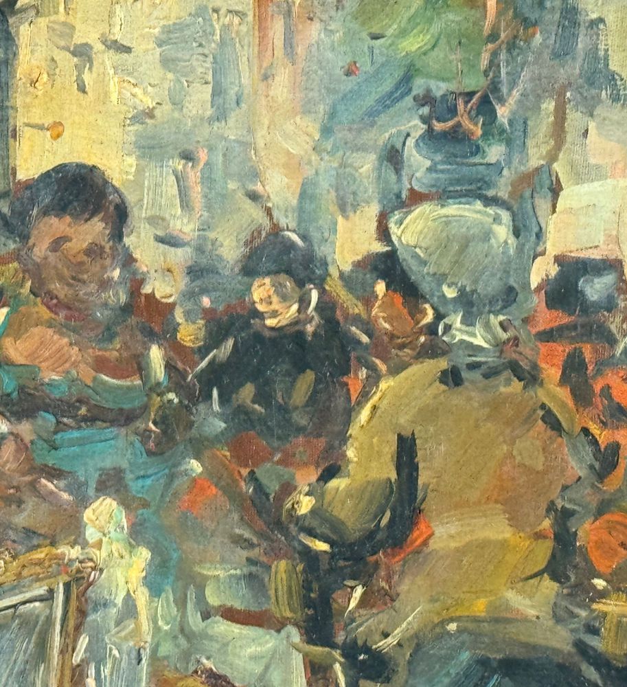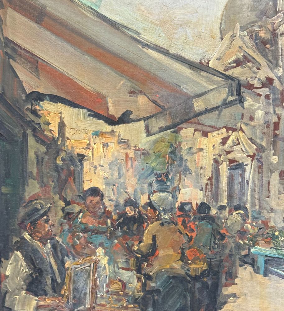 Dipinto olio su tela, periodo XX secolo scuola Italiana, raffigurante Mercatino napoletano. Dimensioni: 70x50 cm. Reca firma in basso a sinistra da Giovanni Pane. Opera in buone condizioni con lievi segni di vissuto come da foto allegate.