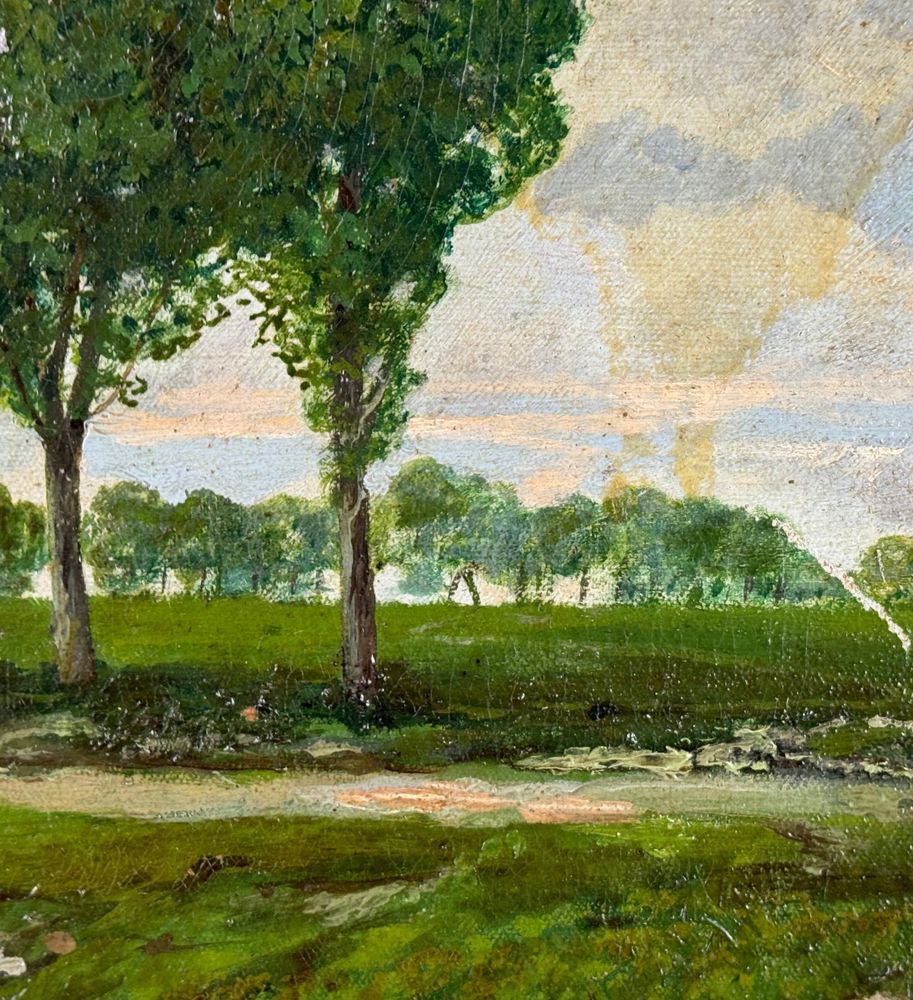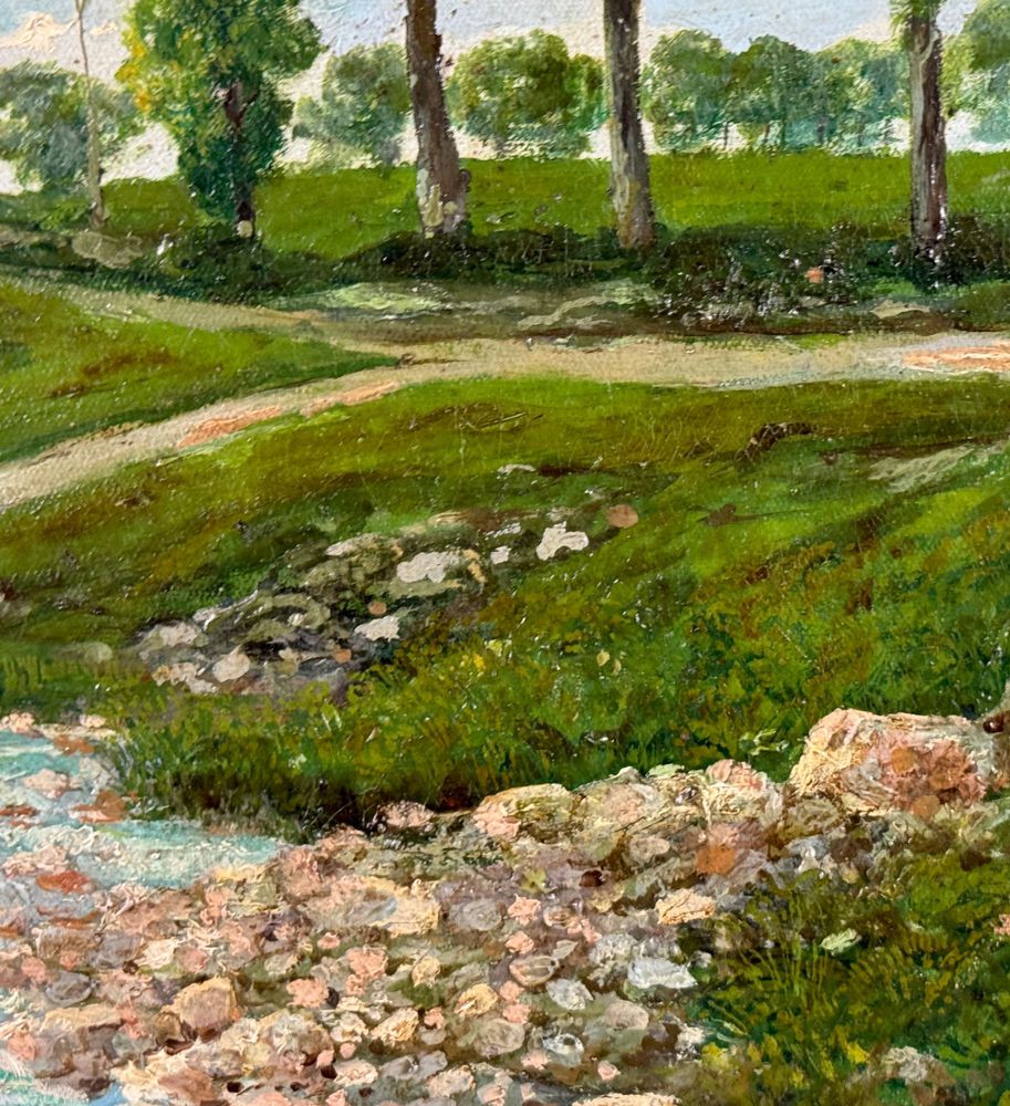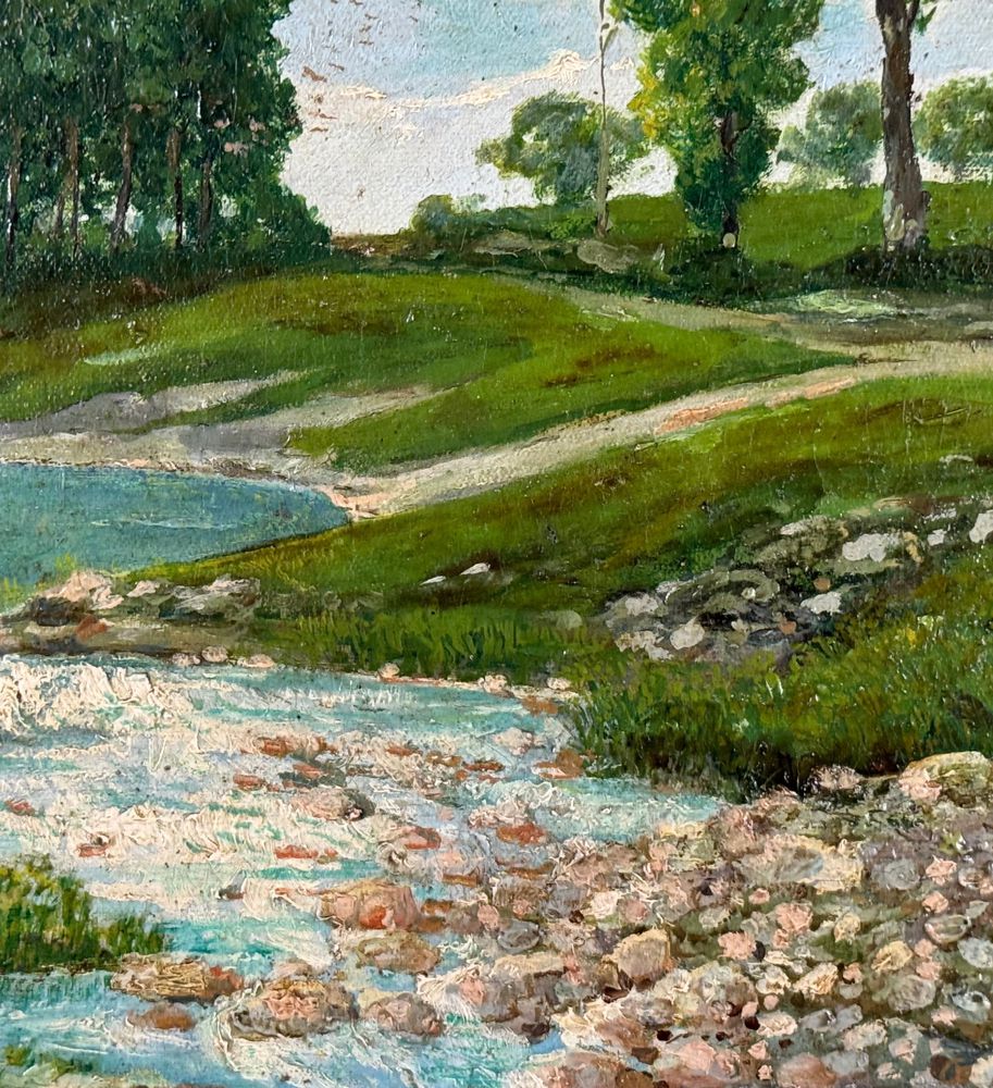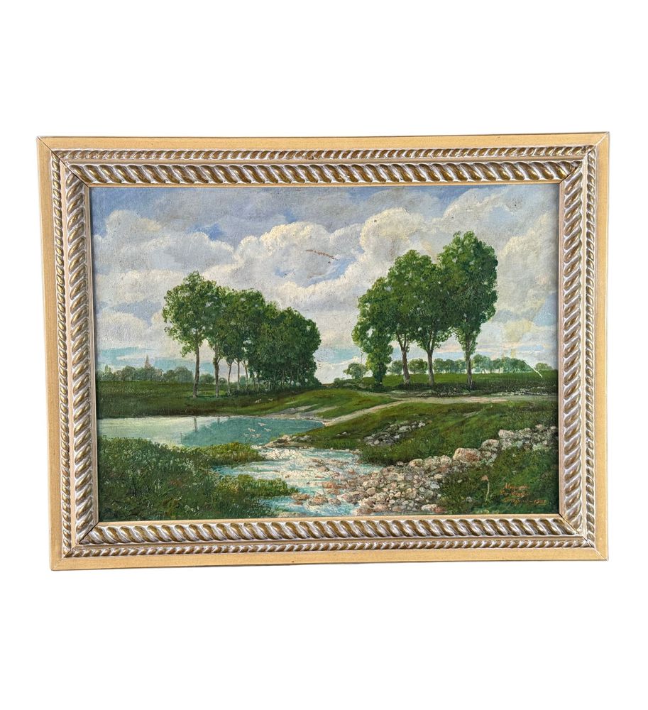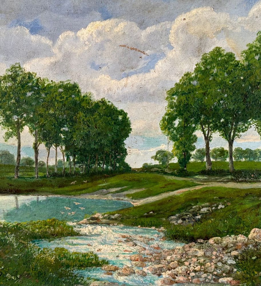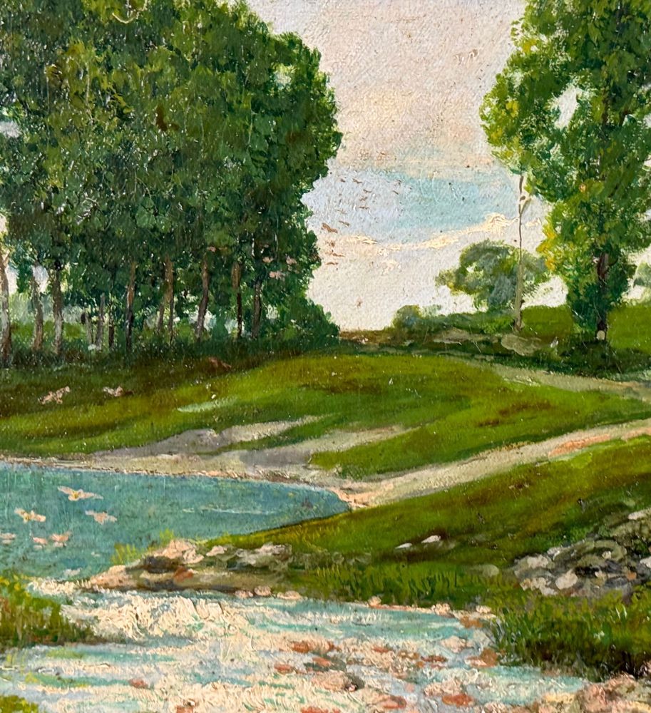 Dipinto olio su tela, periodo primi anni del XX secolo scuola Italiana, raffigurante Paesaggio. Dimensioni compreso cornice: 67x51 cm. Dimensioni interno cornice: 55x40 cm. Reca firma in basso a destra da artista non identificato. Opera in buone condizioni con lievi segni di vissuto come da foto allegate.