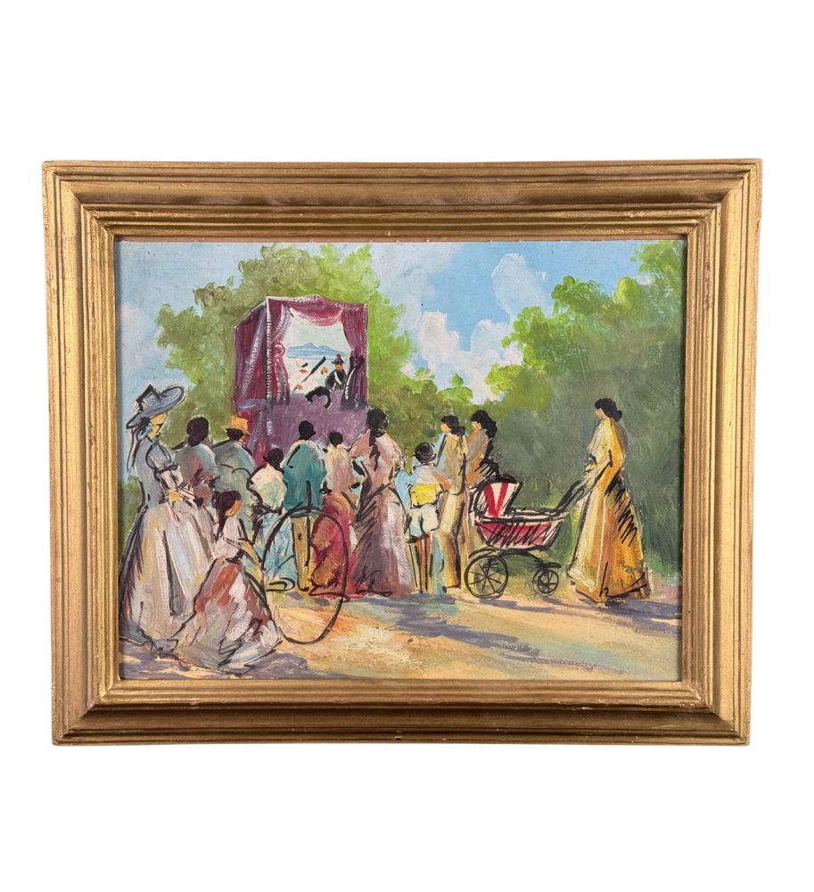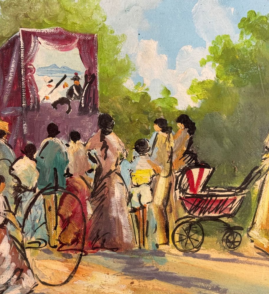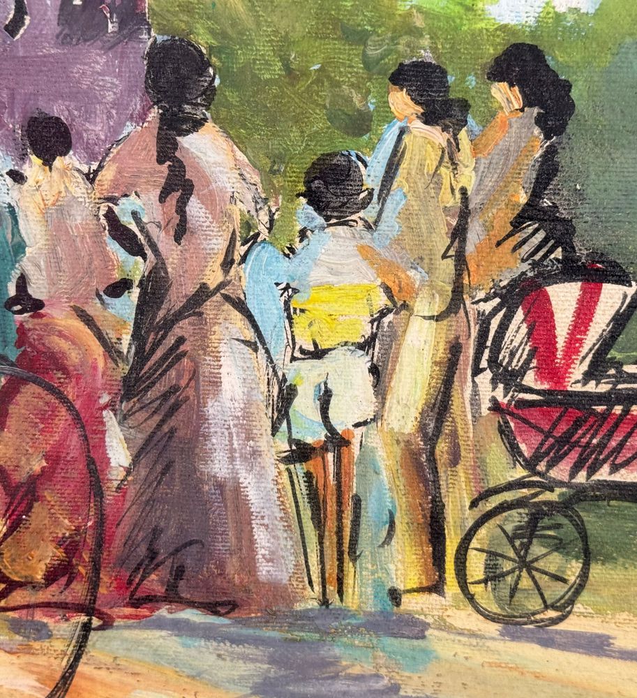 Dipinto olio su tela, periodo XX secolo scuola Italiana, raffigurante Personaggi alla Villa Comunale di Napoli. Dimensioni compreso cornice: 48x40 cm. Dimensioni interno cornice: 30x40 cm. Da artista anonimo. Opera in buone condizioni.