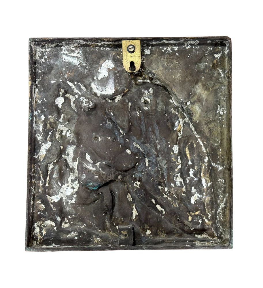 Scultura in arte contemporanea, raffigurante La Morte di Cristo. Dimensioni: h30,5x29,5x8 cm. Scultura in buone condizioni. Reca firma di difficile lettura in alto a destra.