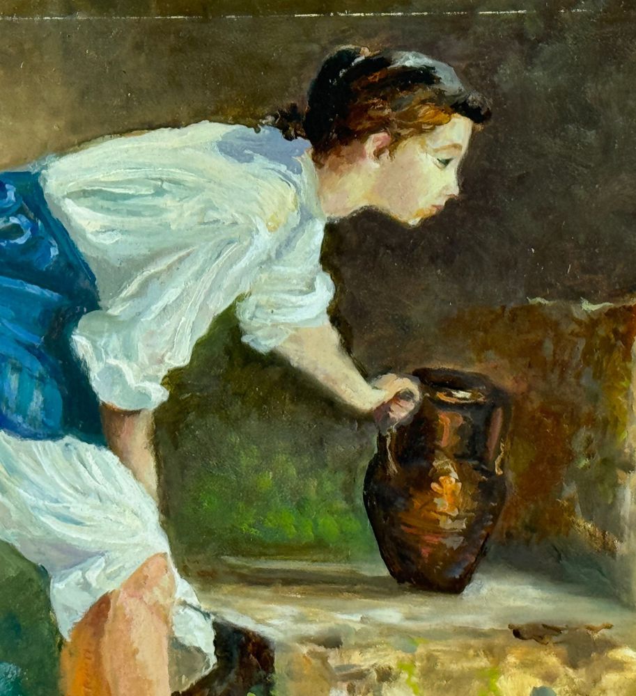 Dipinto olio su pannello, periodo XX secolo scuola Italiana, raffigurante Giovane alla fontana. Dimensioni: 29x21 cm. Da artista anonimo. Opera in buone condizioni.