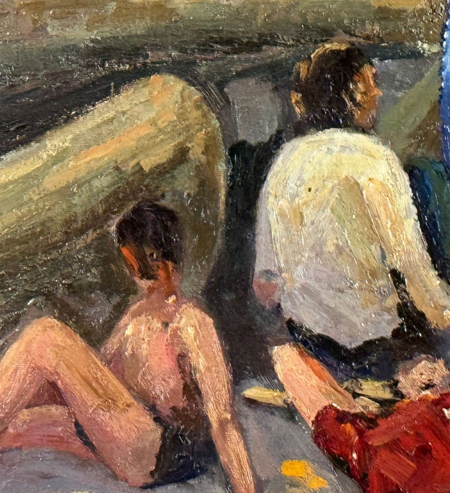 Dipinto olio su tela, periodo XX secolo scuola Italiana, raffigurante Personaggi su marina. Dimensioni: 79x70 cm. Da artista anonimo. Opera in buone condizioni da segnalare sparsi piccoli punti di restauro.