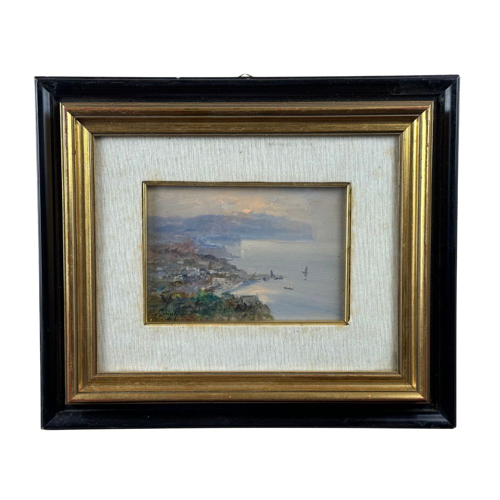 Dipinto olio su tavola, periodo XX secolo scuola Italiana, raffigurante Paesaggio marino. Dimensioni interno cornice: 20x14 cm. Dimensioni compreso cornice: 39x33 cm. Reca firma in basso a sinistra da Vincenzo Laricchia. Opera in buone condizioni.