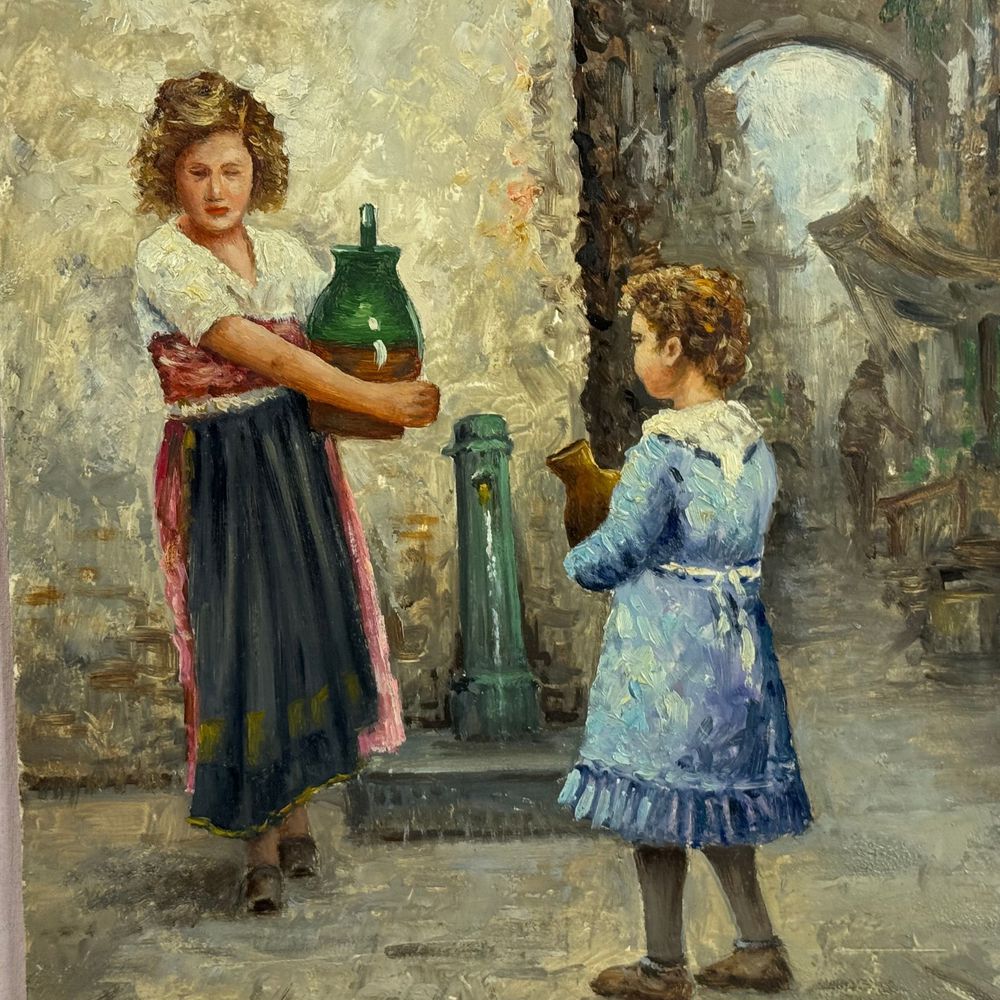Dipinto olio su tavola, periodo XX secolo (1940 - 1950) scuola Italiana, raffigurante Bambini alla fontana. Dimensioni: 30x40 cm. Da artista anonimo. Opera in buone condizioni e di ottima qualità artistica.