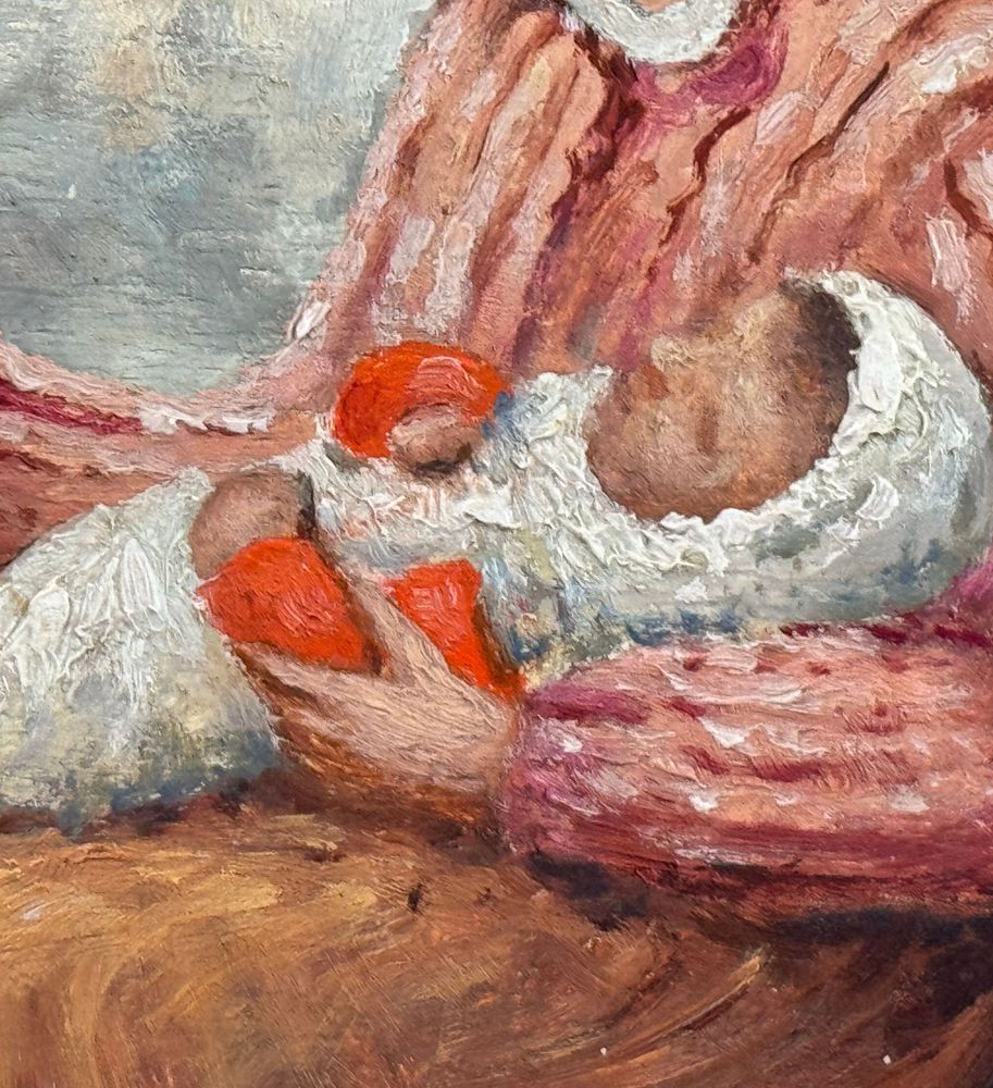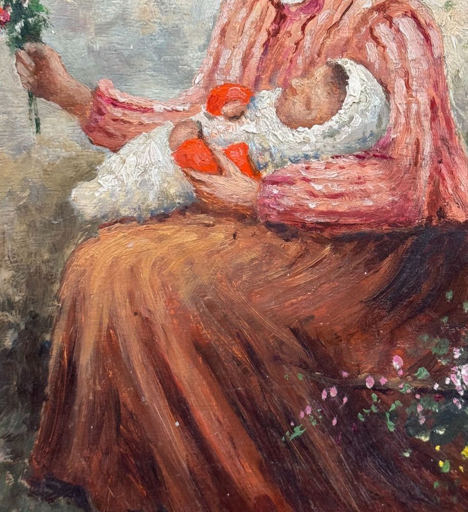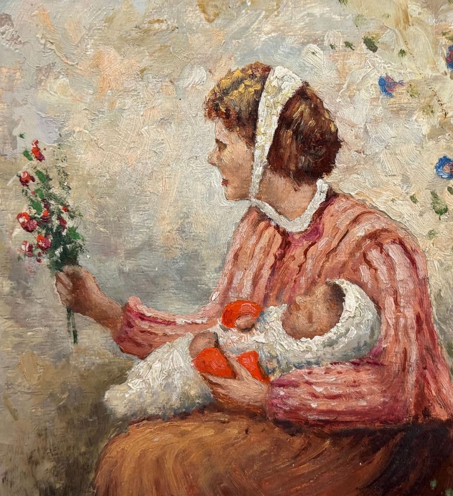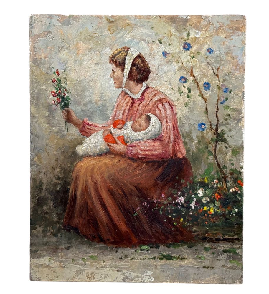Dipinto olio su tavola, periodo primi anni del XX secolo, scuola Italiana, raffigurante Scena materna. Dimensioni: 24x30 cm. Da artista anonimo. Opera in buone condizioni.