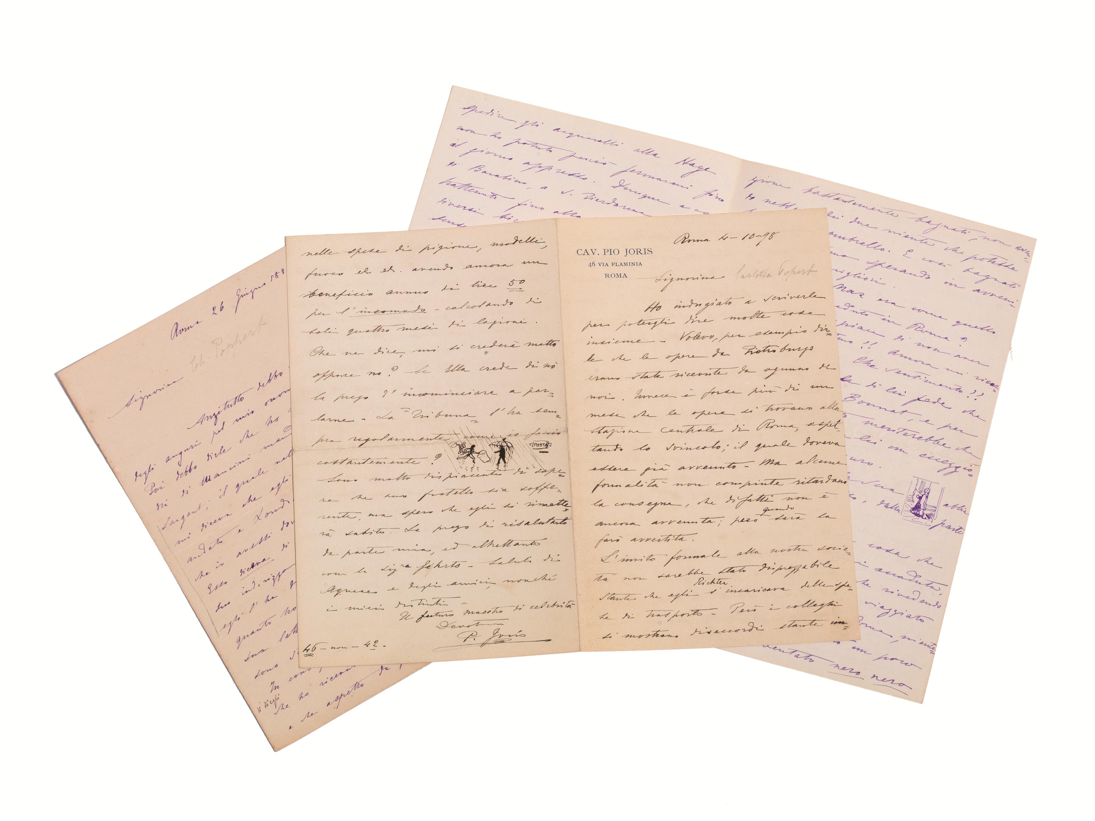 JORIS, Pio (1843-1922). Tre lettere autografe firmate, ciascuna su 4 pagine in 8vo, tutte indirizzate ad una “Signorina” (una nota a matita la identifica come la sua allieva Carlotta Ida POPERT, 1848-1923), e scritte da Roma, la prima nel 1882, la seconda nel 1884, la terza nel 1898 (quest’ultima su carta intestata “Cav. Pio Joris | 46 via Flaminia | Roma”). Il pittore scrive in modo colloquiale di argomenti vari. Parla di John Singer SARGENT (1856-1925) al quale ha consigliato di accettare senz’altro l’invito di Daniel Sargent Curtis ad andare a Venezia nonostante il pittore Guido Boggiani lo abbia contemporaneamente invitato a Stresa; racconta inoltre che Sargent “ha regalato il suo quadro esposto a Torino, per scopo di beneficienza” nonostante sia “sempre disperato a quattrini”. Nella medesima lettera, Joris racconta del concorso per il progetto del Vittoriano, per il quale erano stati inizialmente selezionati il tedesco Bruno Schmitz, Manfredo Manfredi e Giuseppe Sacconi: “Tutti e tre si sono portati valorosamente ma la gloria, e l’esecuzione del Monumento è rimasta al Sacconi” la cui opera “è semplicemente un capolavoro”. Joris attribuisce questo risultato al “voto palese e non segreto”. Nella missiva del 1898, scrive di avere iniziato il quadro del “Giovedì Santo” (che porterà a termine nel 1900 ed è considerato dalla critica a lui contemporanea come il suo capolavoro); “avrà una dimensione piuttosto grande, ma non grandissima, il lato maggio è di m. 2.20.” Due lettere recano graziose vignette.