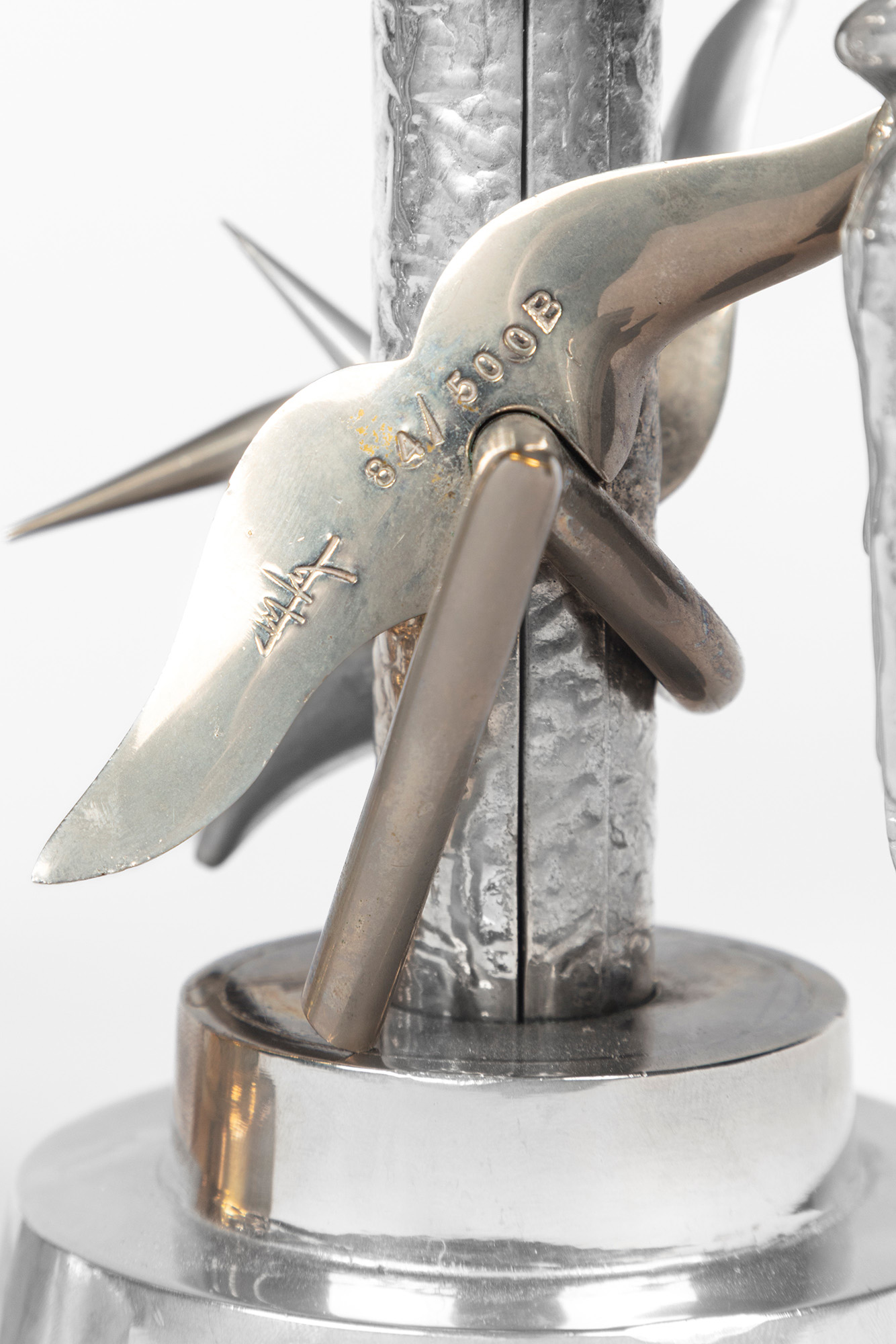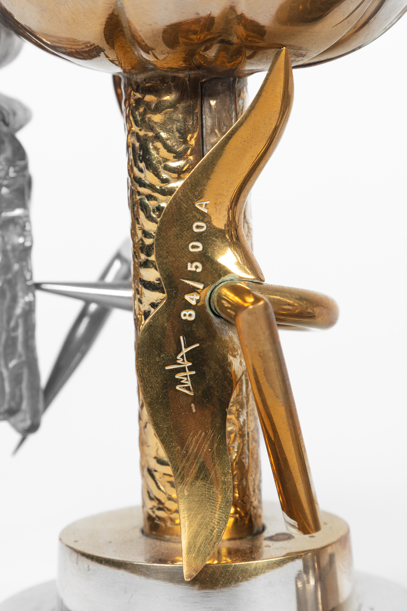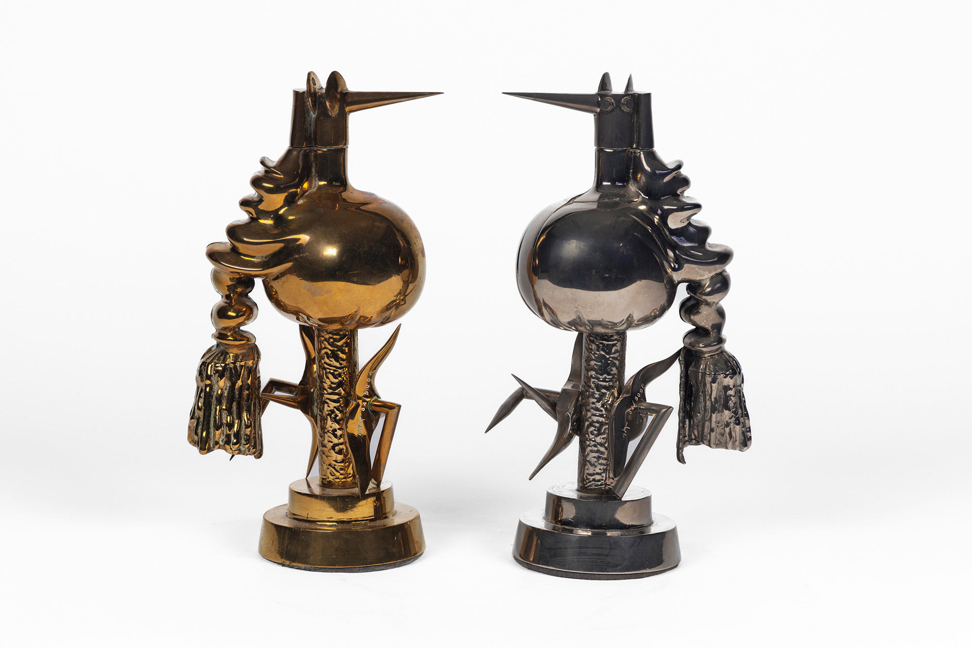 Firma incisa sul lato destro coppia di multipli in ottone dorato e in metallo cromato argentato, ess. 84/500A e 84/500B