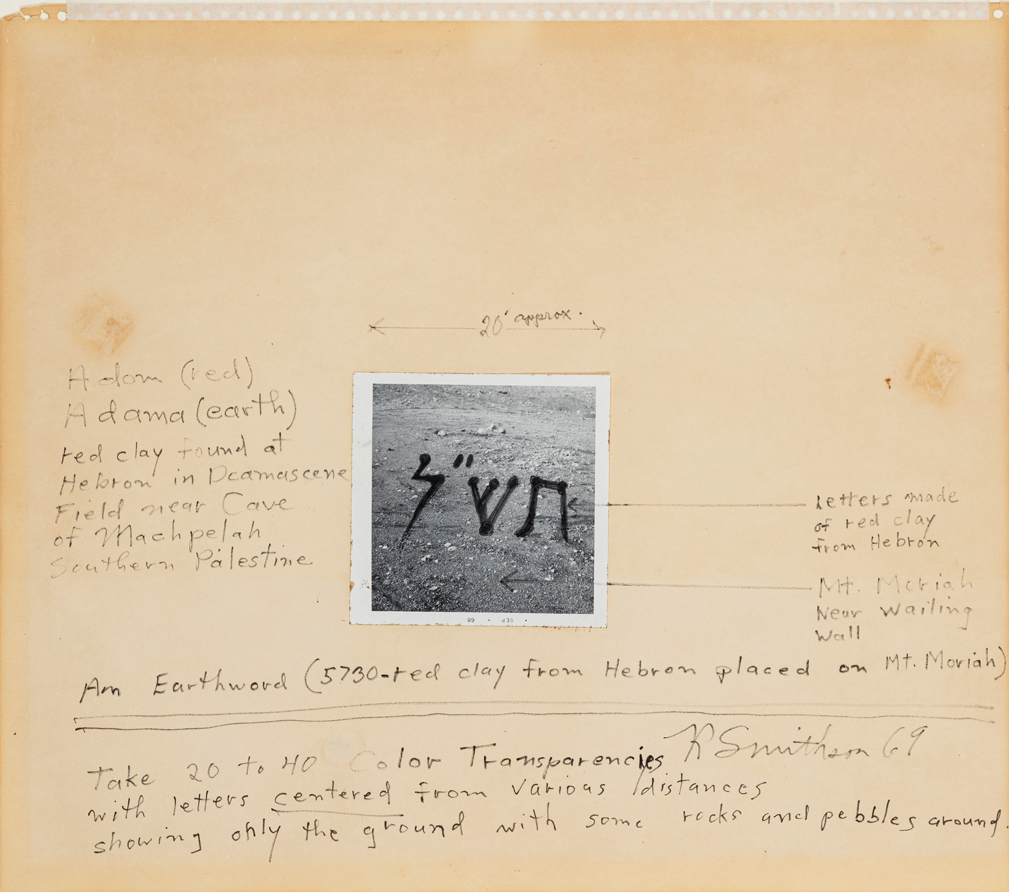 Firmato e datato lungo il margine inferiore: R. Smithson, An Earthwork (5730-Red Clay from Hebron placed on Mt. Moriah), 69