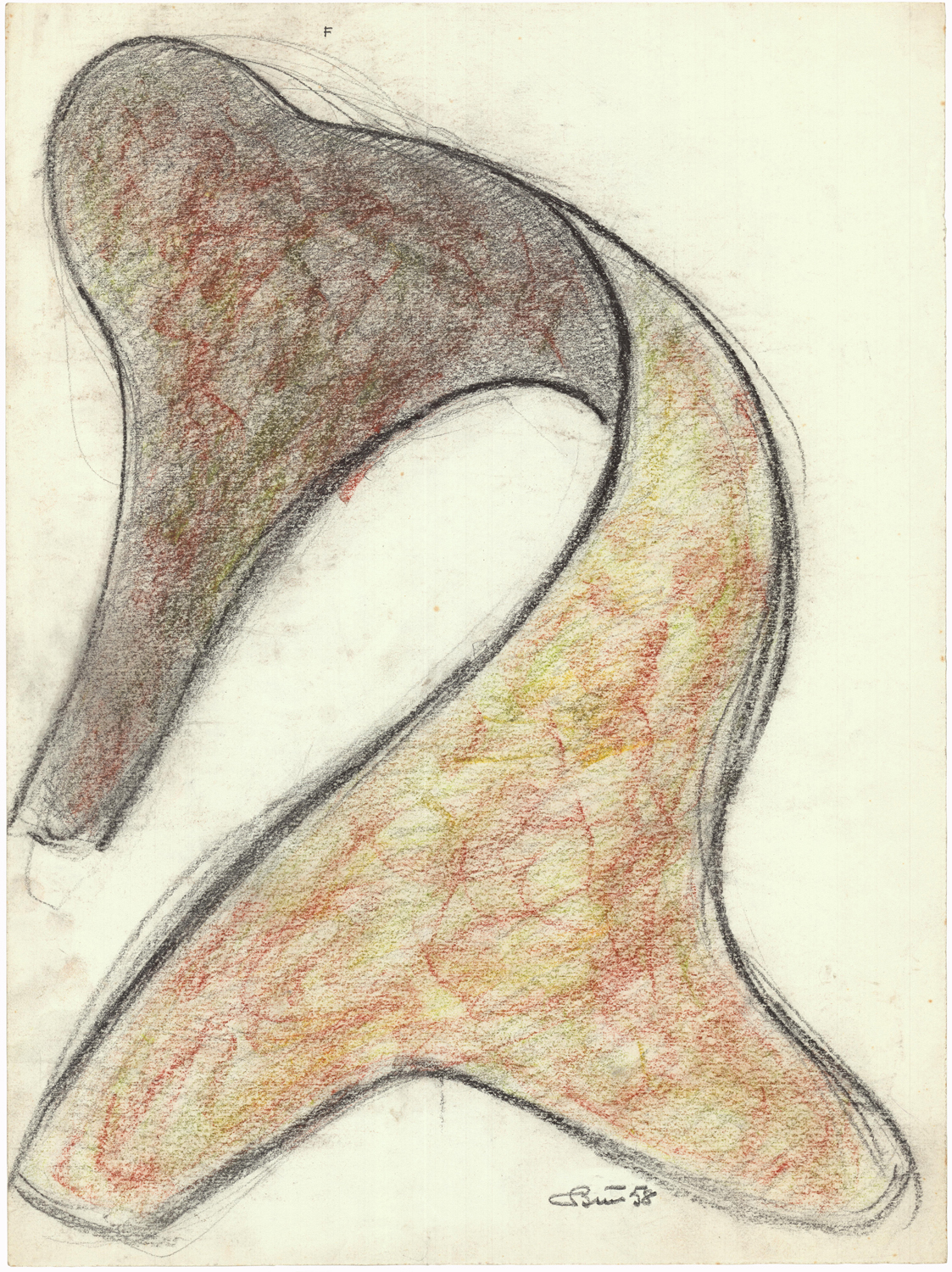 Studio per un'opera della serie "Sintesi zoomorfe”. Benché non sia nota alcuna scultura con questo design, le dimensioni del foglio e il materiale - carta da pacchi - suggeriscono che si tratti di un disegno esecutivo, cioè impiegato dall'artista in laboratorio per la fase realizzativa della scultura. Benetton si interessava, negli anni Cinquanta, alle forme viventi, semplificandole al punto che l'originario suggerimento figurativo - per esempio di un vegetale o di un animale - veniva reso in modo quasi astratto. In asta è presente anche un disegno preparatorio per lo stesso soggetto.
