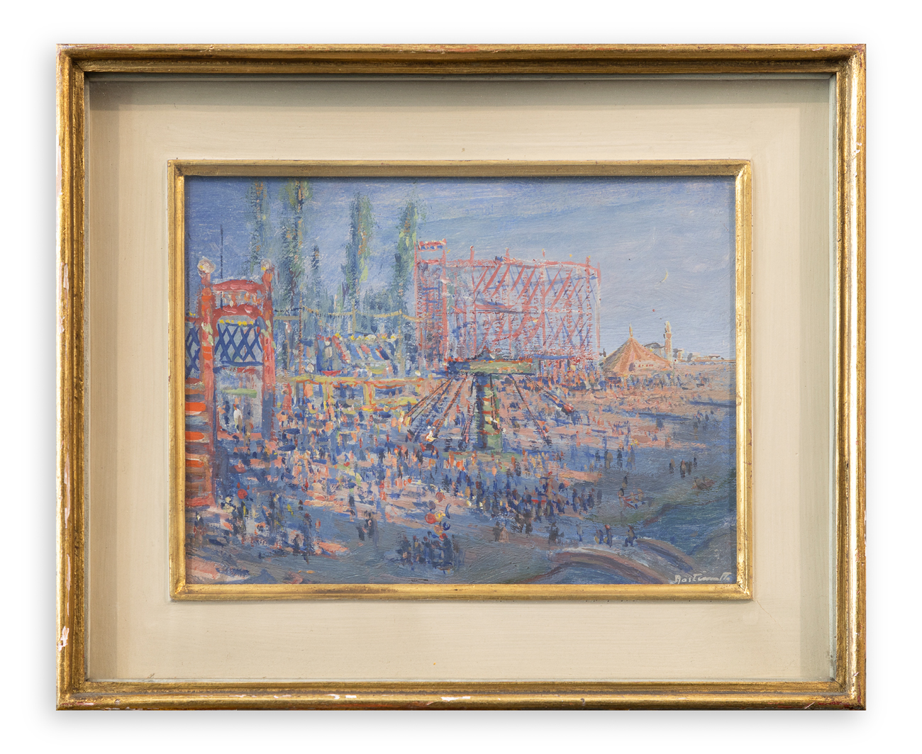 'Bozzetto del quadro 'Parco dei divertimenti' che ritengo uno dei miei più riusciti lavori. Era esposto alla Triveneta del 1949 e mi è stato acquistato dall'Ente per il Turismo. Credo di essere riuscito a dare il senso del movimento, del frastuono, della confusione, del chiasso e l'allegria di un parco con il turbinare dei colori, di un caos di colori riscaldati dal sole al tramonto che dà le ombre lunghe sulle cose e sugli uomini. Il parco con le sue giostre, con l'otto volante, il capannone del circo, i tiri a bersaglio e tutte le altre meraviglie è installato in un paese del Veneto, un po' fuori dal Paese e vi scorre a destra un'acqua che dà frescura al paesaggio estivo' (Tratto da uno scritto dell'Artista riportato sul catalogo in bibliografia)