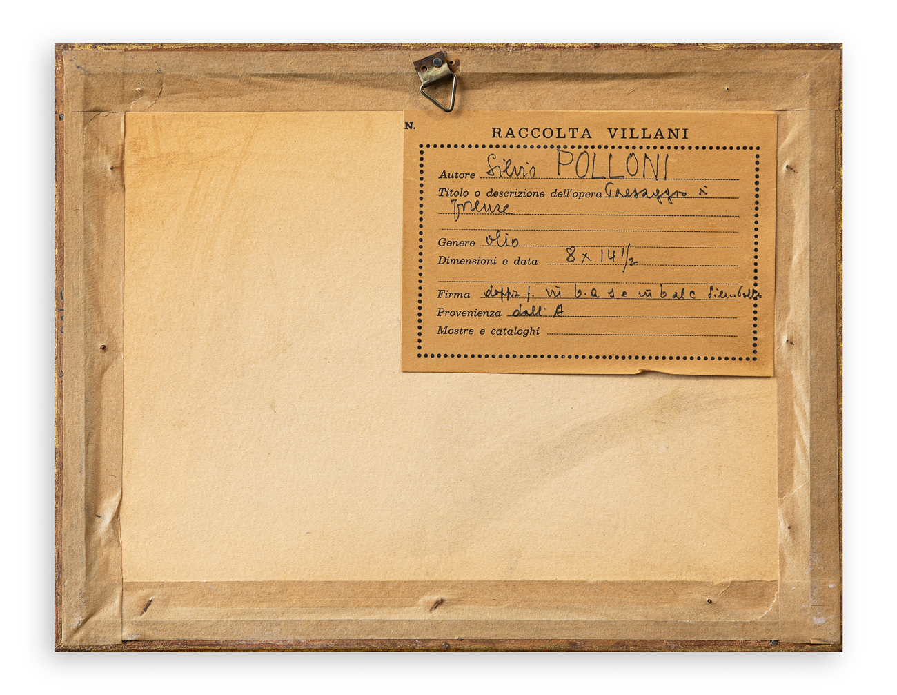 Etichetta della Raccolta Villani, recante caratteristiche tecniche dell'opera, al retro del cartoncino protettivo