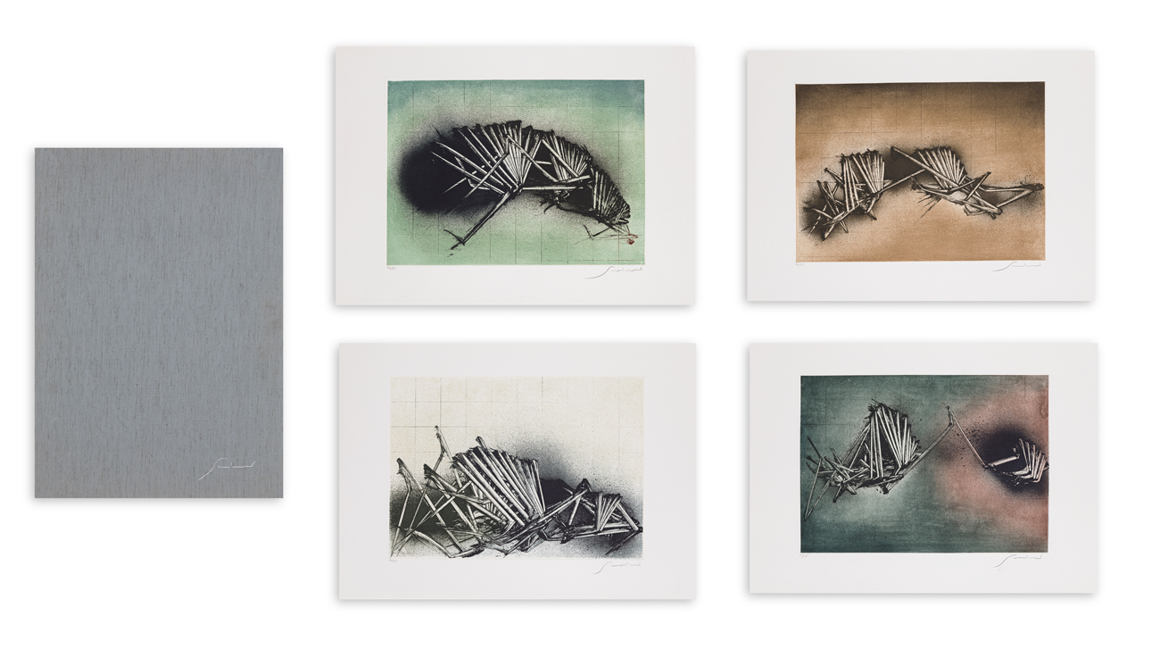 Cartella contenente 4 acqueforti di Emilio Scanavino, 4 sonetti di Edoardo Sanguinetti ed un testo critico di Giuliano Menato