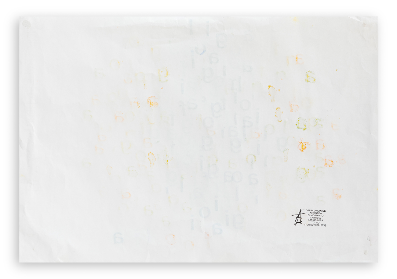 Timbro della vedova dell'Artista 'Opera originale autentica di mio marito l'artista Arrigo Lora Totino' al retro