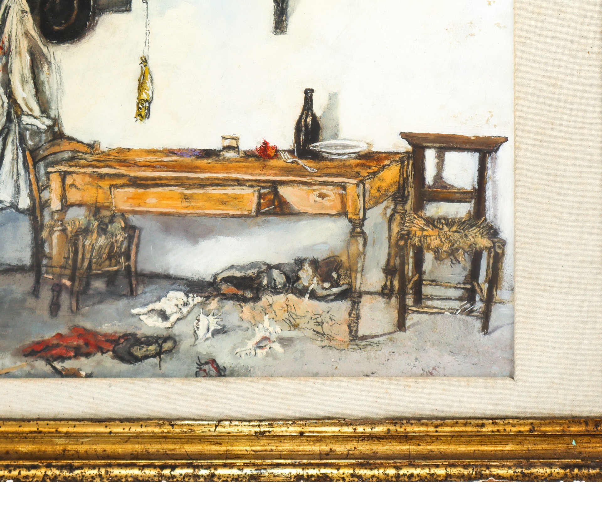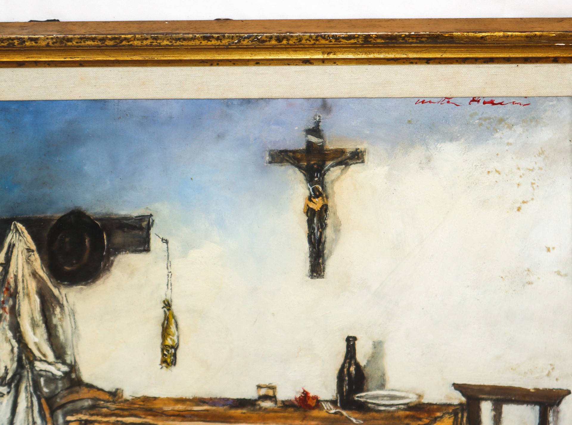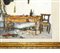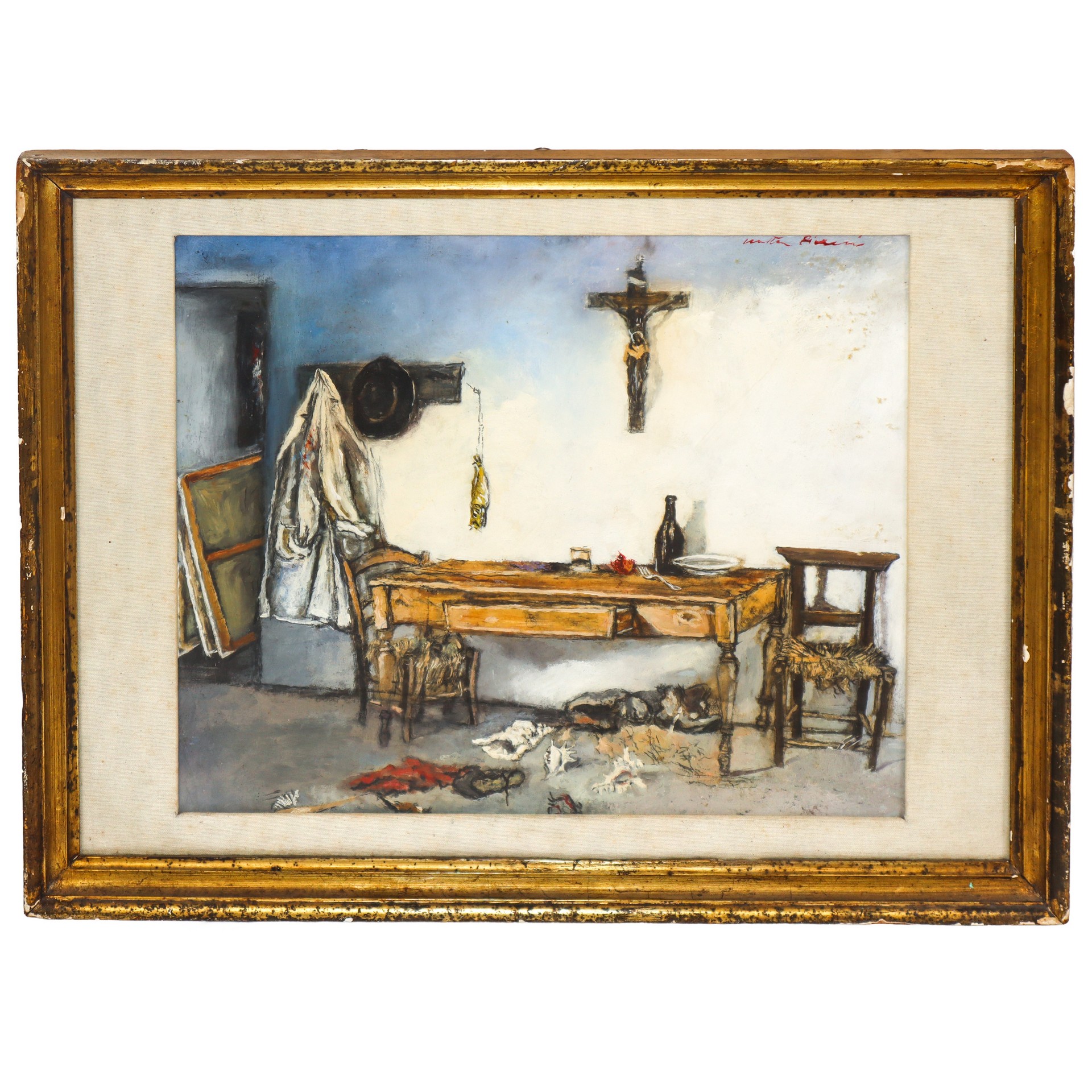 Walter Piacesi - Angolo dello studio con varie cose h cm 49,5X49 in cornice h cm 55X69 olio su cartone applicato a tavola Firmato in alto a destra