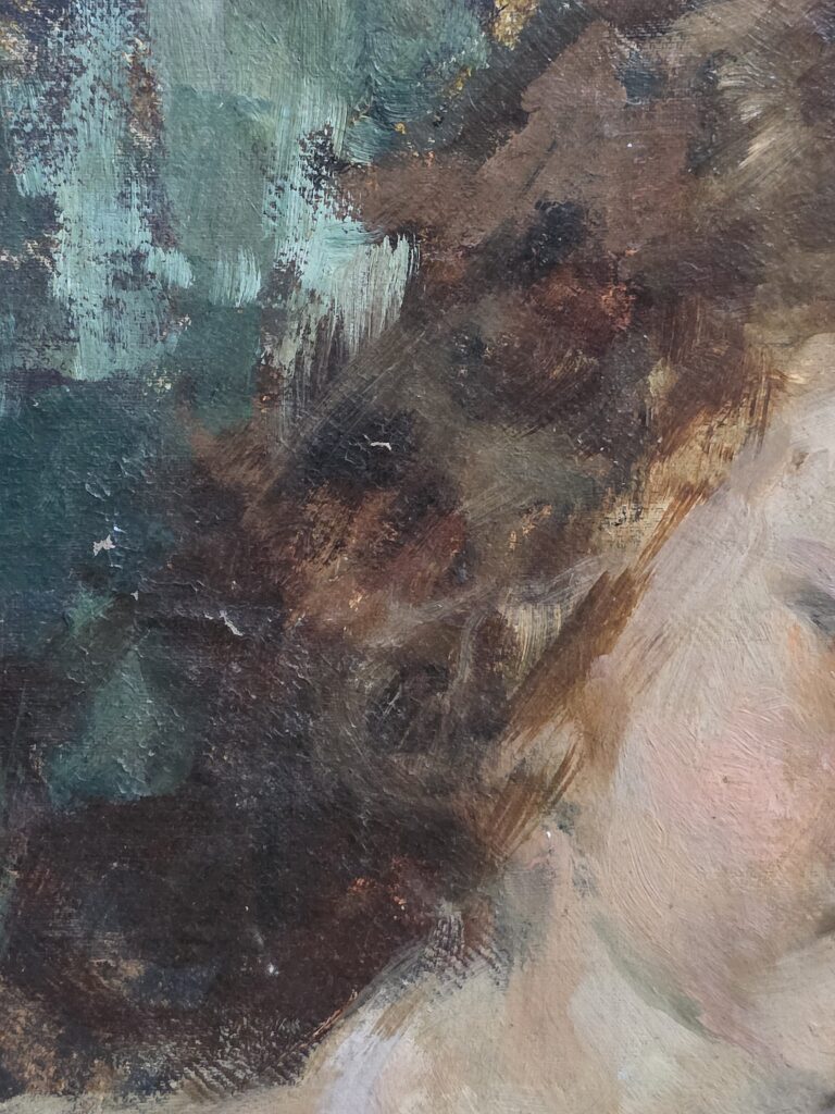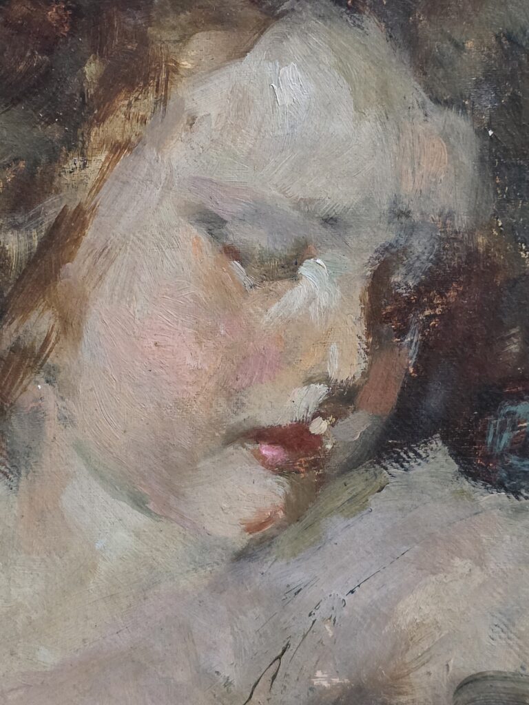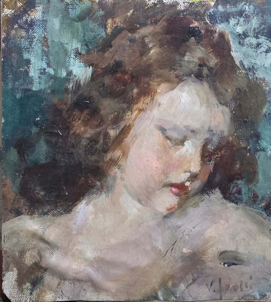 Vincenzo Irolli (1860-1949).Olio su tela applicata su cartoncino.Cm.31,5 x 36 Misure: cm.31,5 x 36 Olio su cartoncino Ritratto di bambina Firma in basso a destra