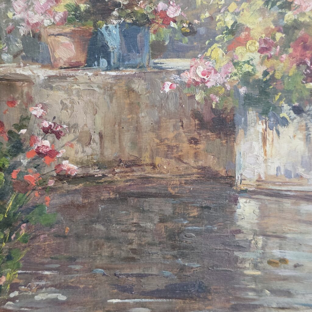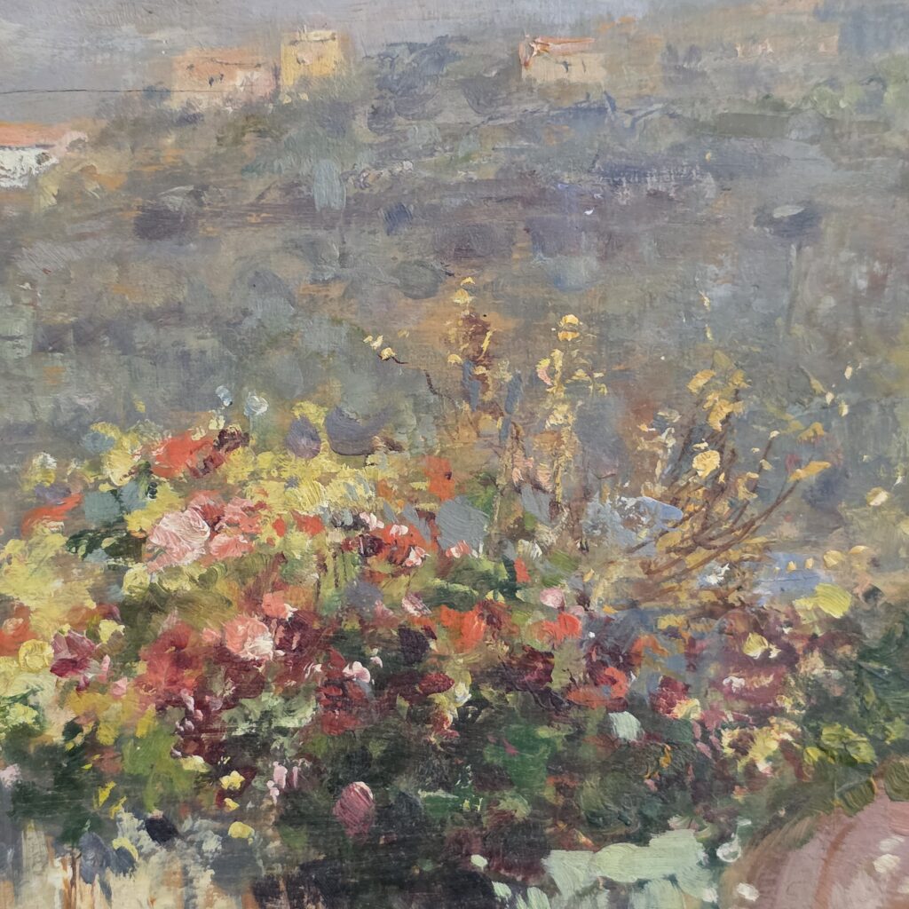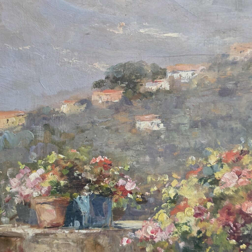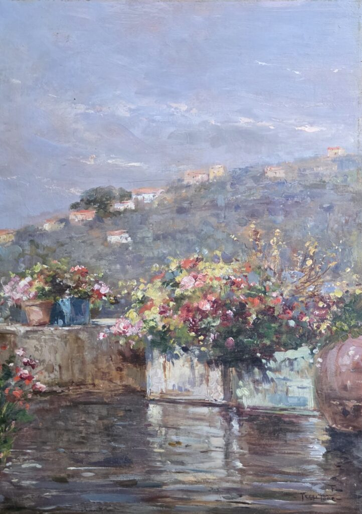 Fulvio Tessitore (1870-1933). Terrazzo.Cm.28 x 40 Misure: cm.28 x 40 olio su pannello. Terrazzo. Firma in basso a destra F.Tessitore.