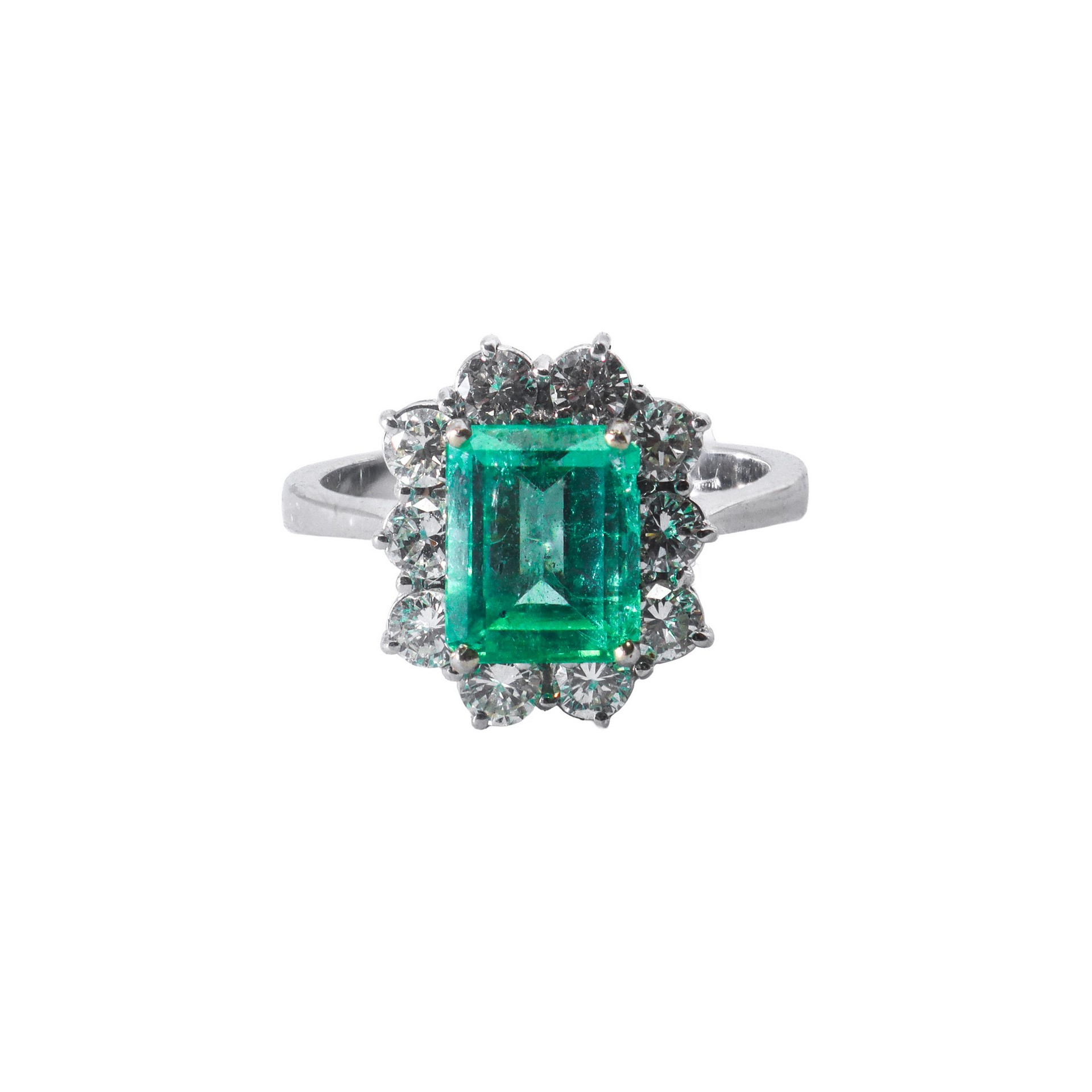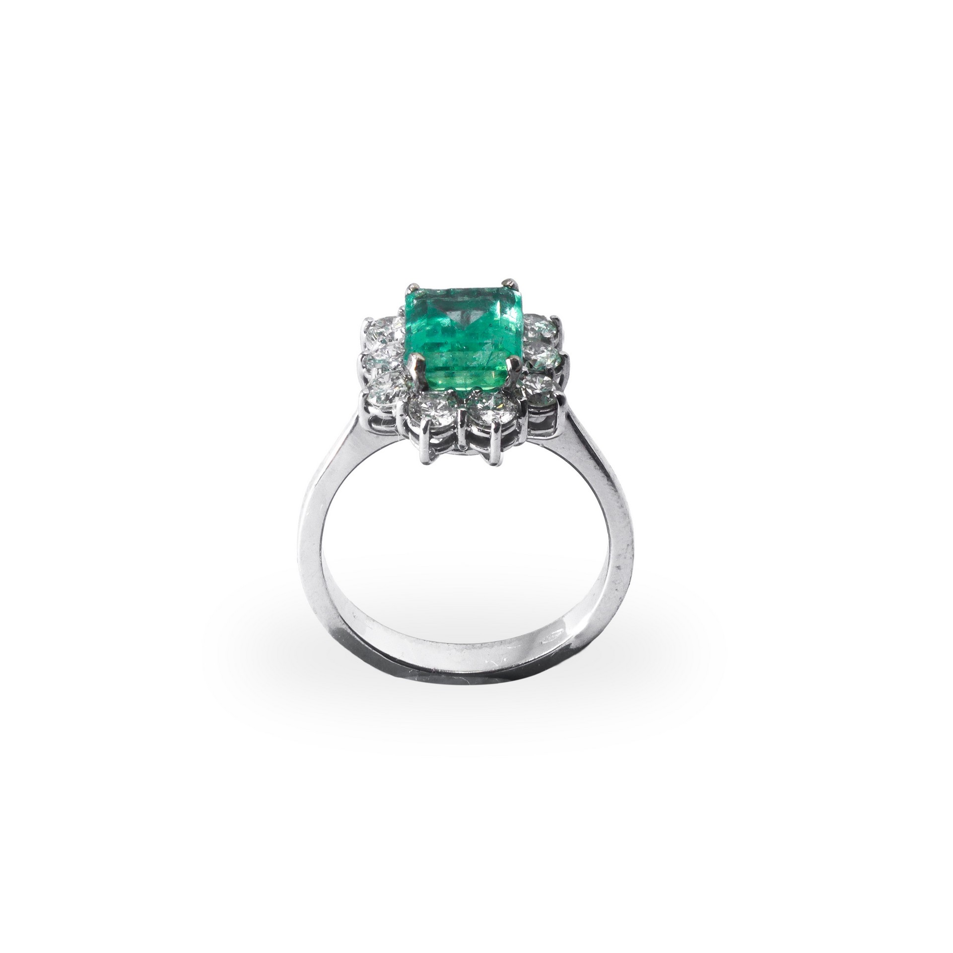 Anello in oro bianco con berillo (varietà smeraldo) di forma rettangolare formato a gradino con diamanti intorno peso totale 5,7 ka pietra 2,20 diamani 0,60 ka mis. 16 (56)