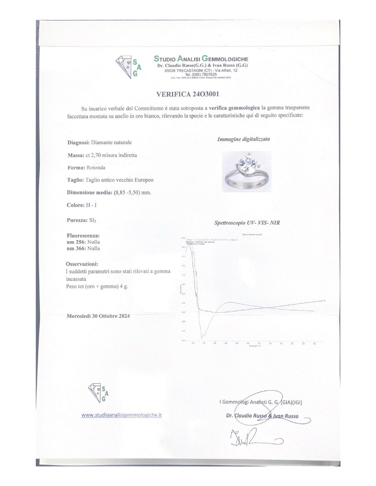 Anello Solitario mis. 15 (55) ct 2,70 mis ind, peso tot. (oro+gemma) 4 gr. Anello in oro bianco 18kt, diamante taglio brillante di ct 2,70. Analisi gemmologica: diamante naturale di forma totonda taglio antico vecchio europeo, dimensione media 8.85-5,50 mm, colore H-I, purezza SI2, I PARAMETRI SONO SONO STATI RILEVATI A GEMMA INCASSATA