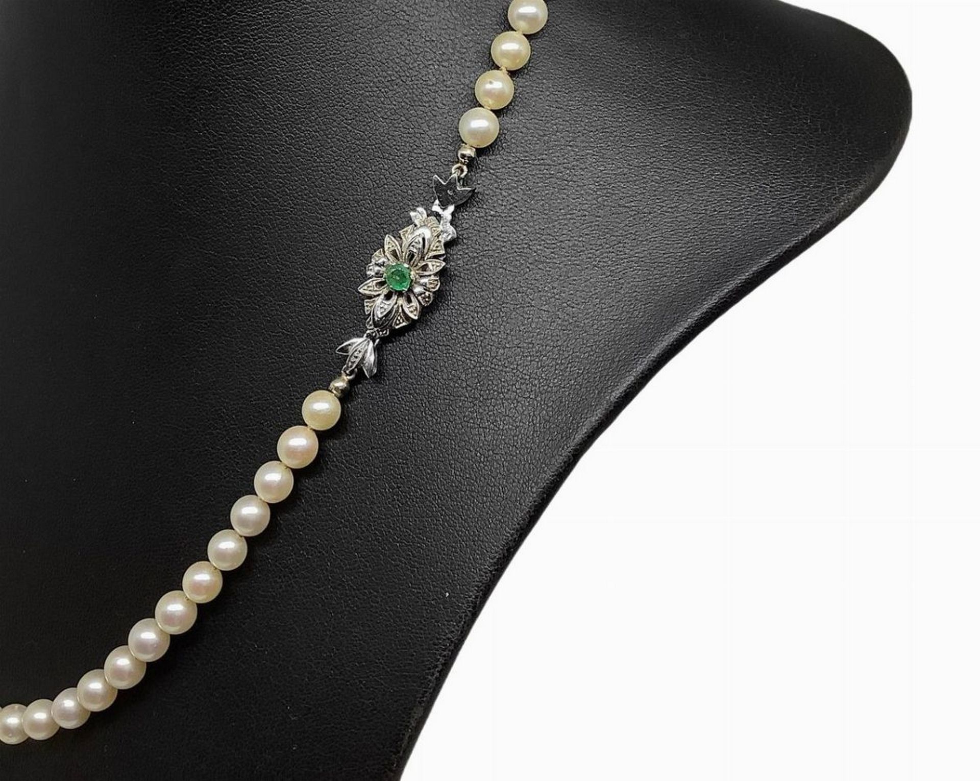 Collana di perle con chiusura in oro bianco e smeraldo centrale. Lunghezza cm 55