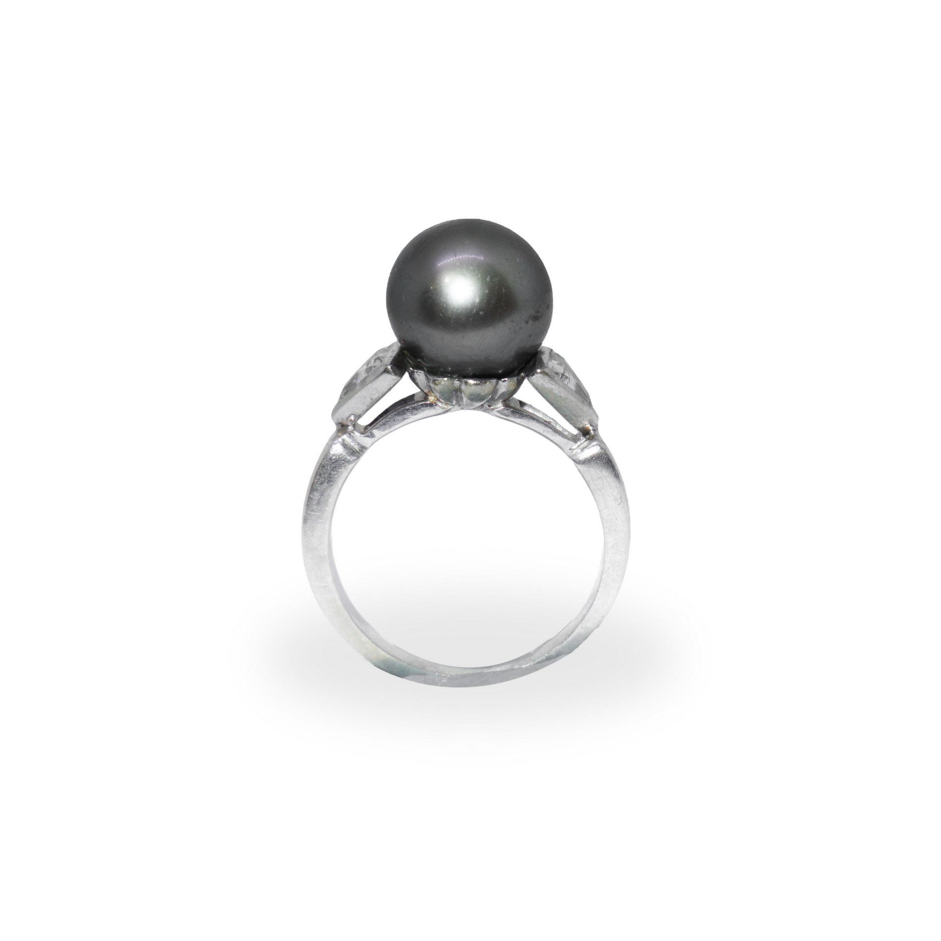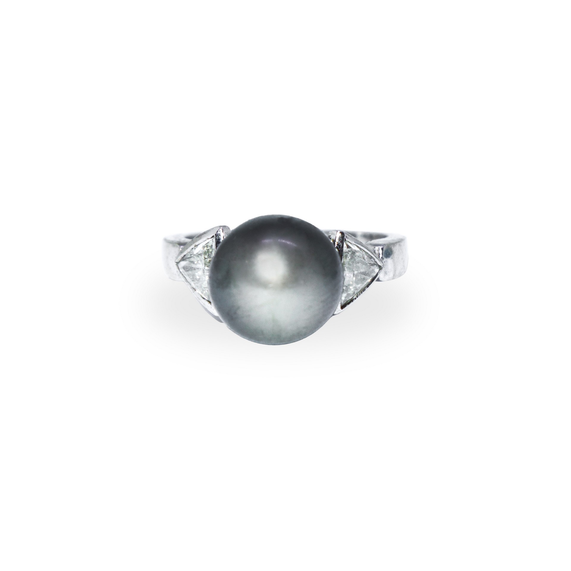 Lot 67 | Anello con perla grigia e brillanti triangolari ai lati