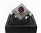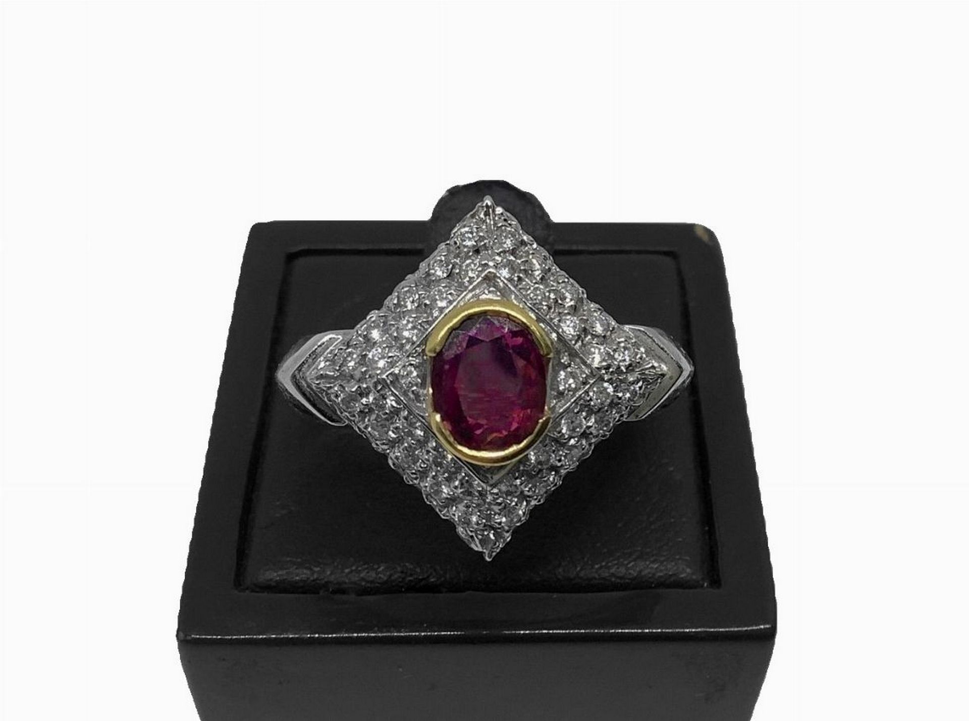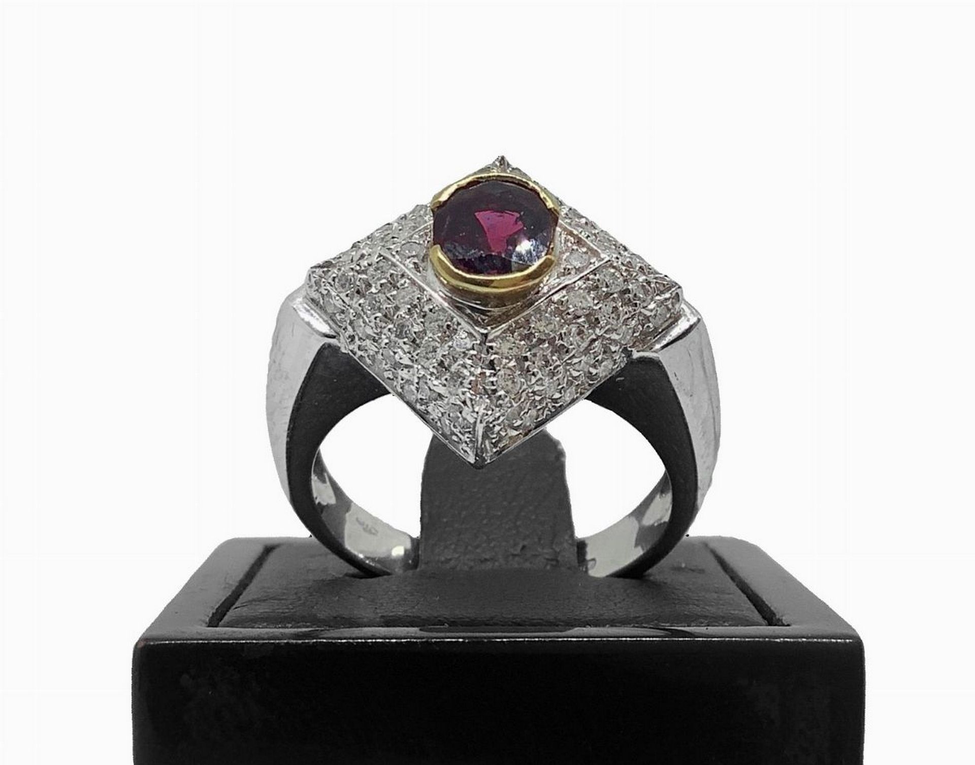 Anello in oro bianco con brillanti e rubino montato su oro giallo