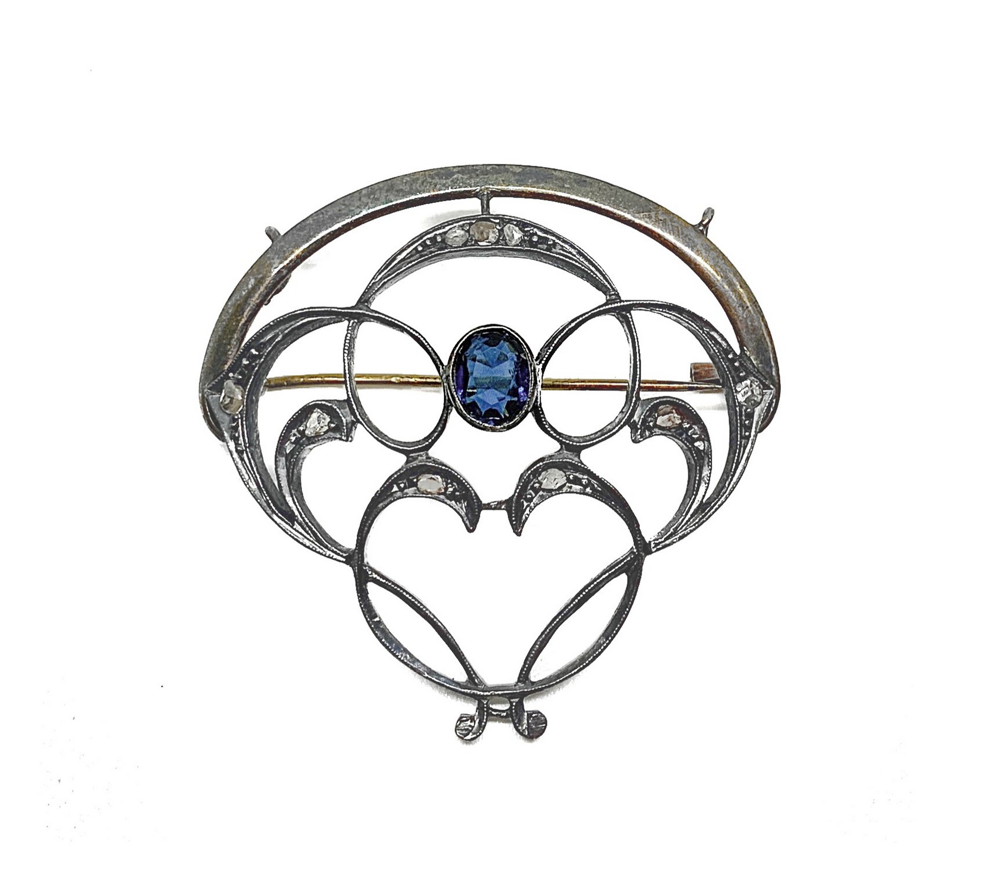 Spilla in Argento , 20th century Gr. 8,2 Lavorazione in argento con zaffiro centrale e rose coronè.