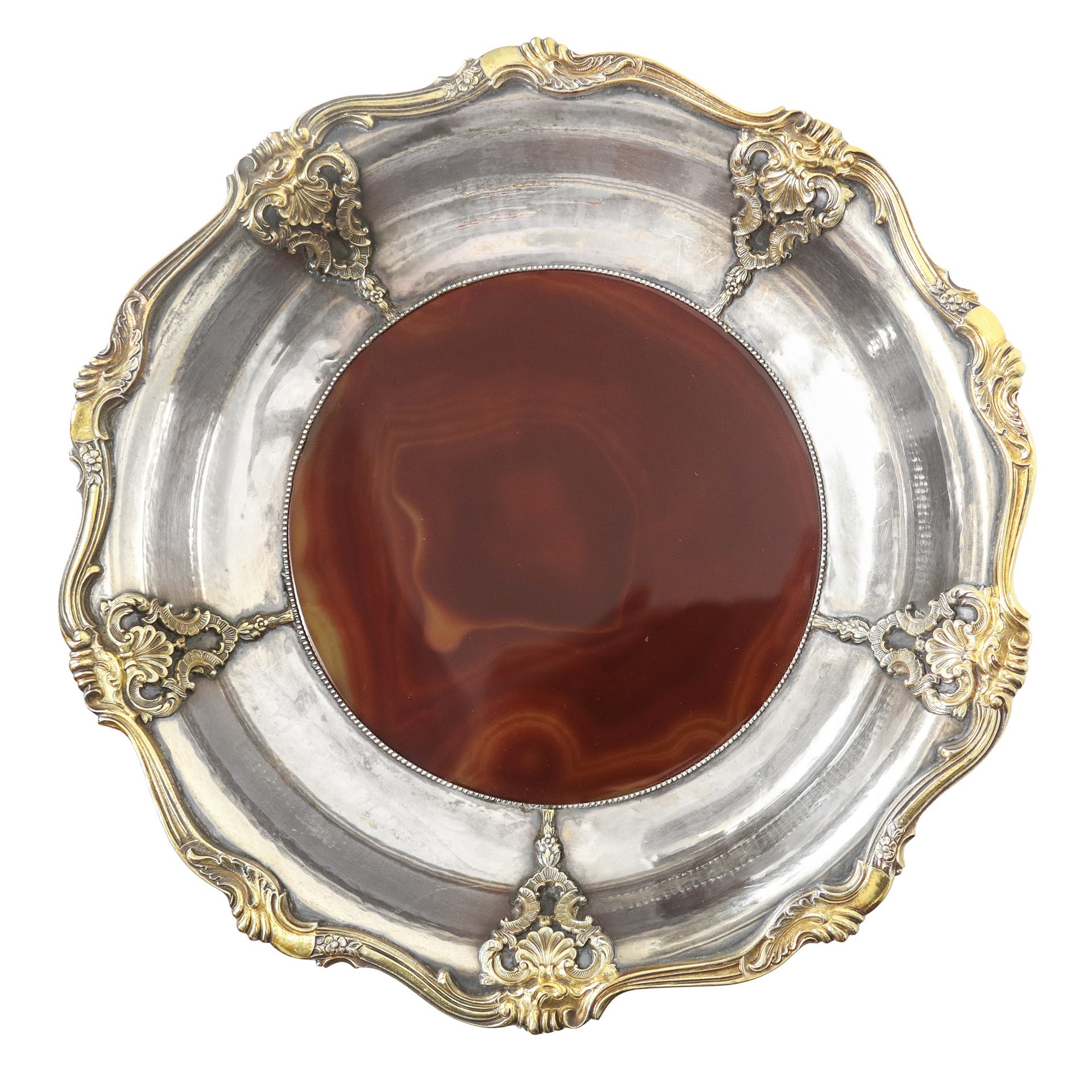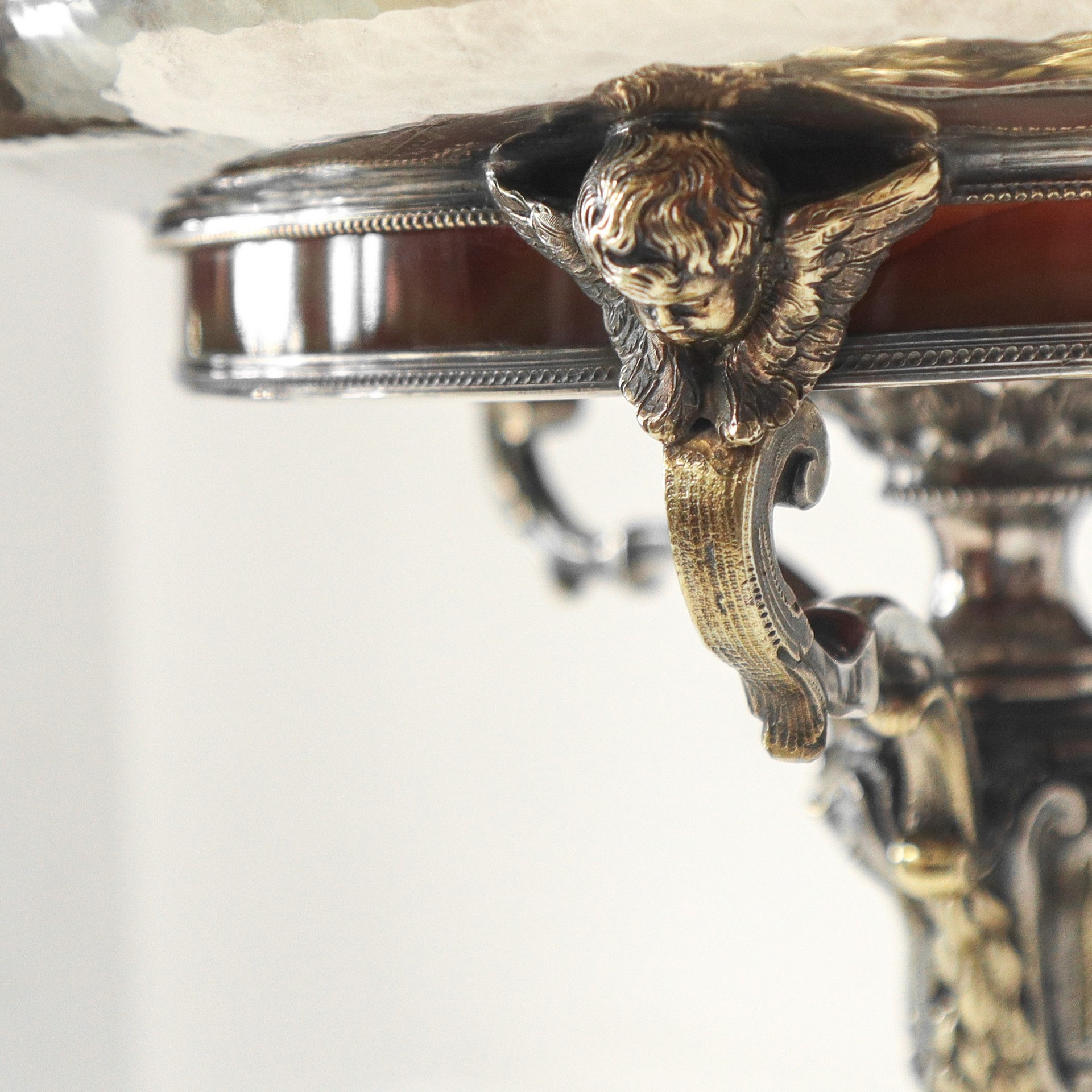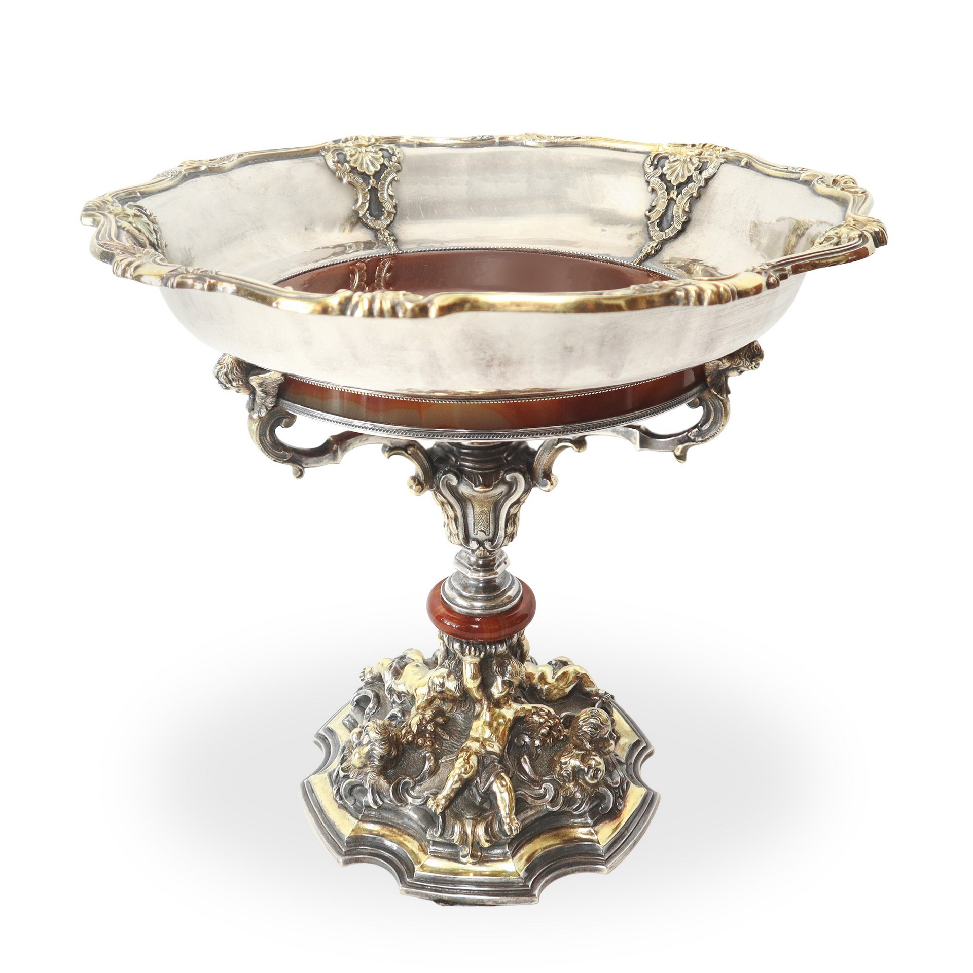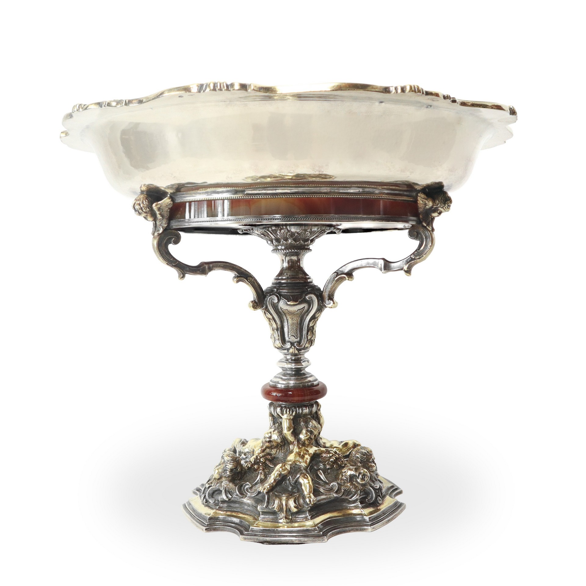 Enea Stefani (1886 - 1974) - Alzata centrotavola in argento e argento vermeil con putti alla base e parti in corniola