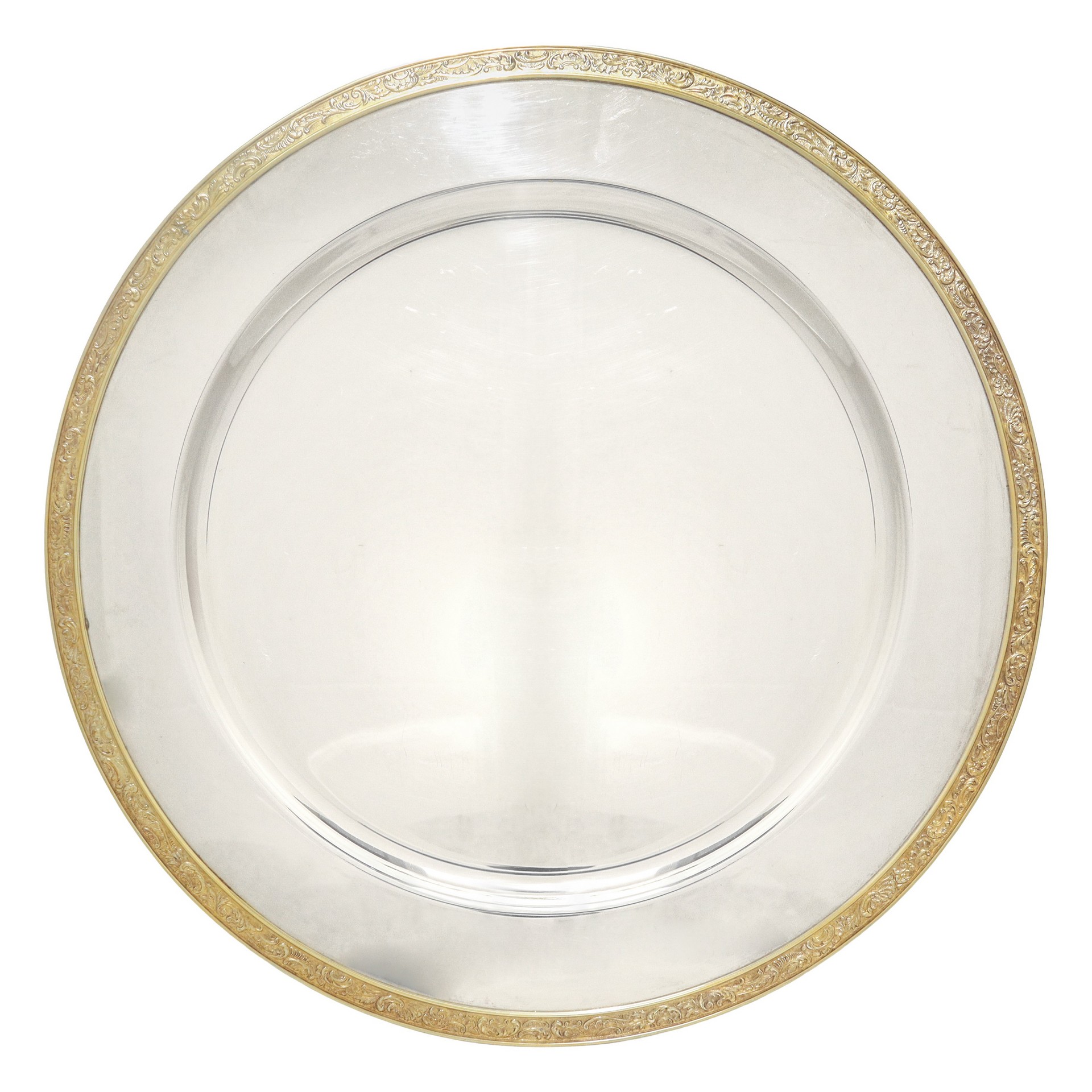 Argenteria Stefani (Bologna primi del '900) - Centrotavola silverplated con bordo dorato e decorato a rilievo composto da piatto e sottopiatto
