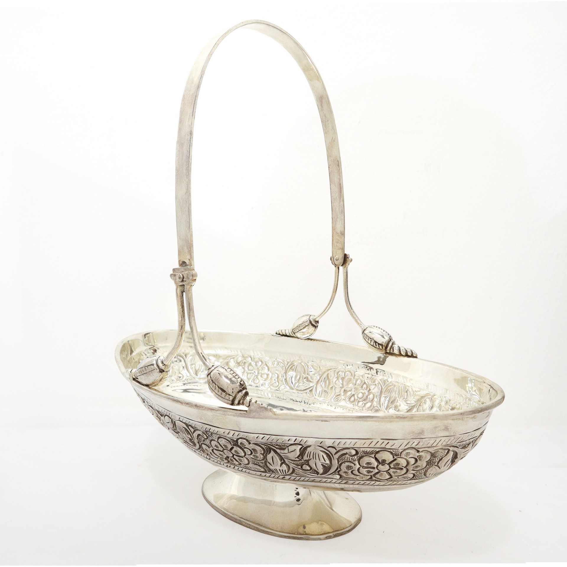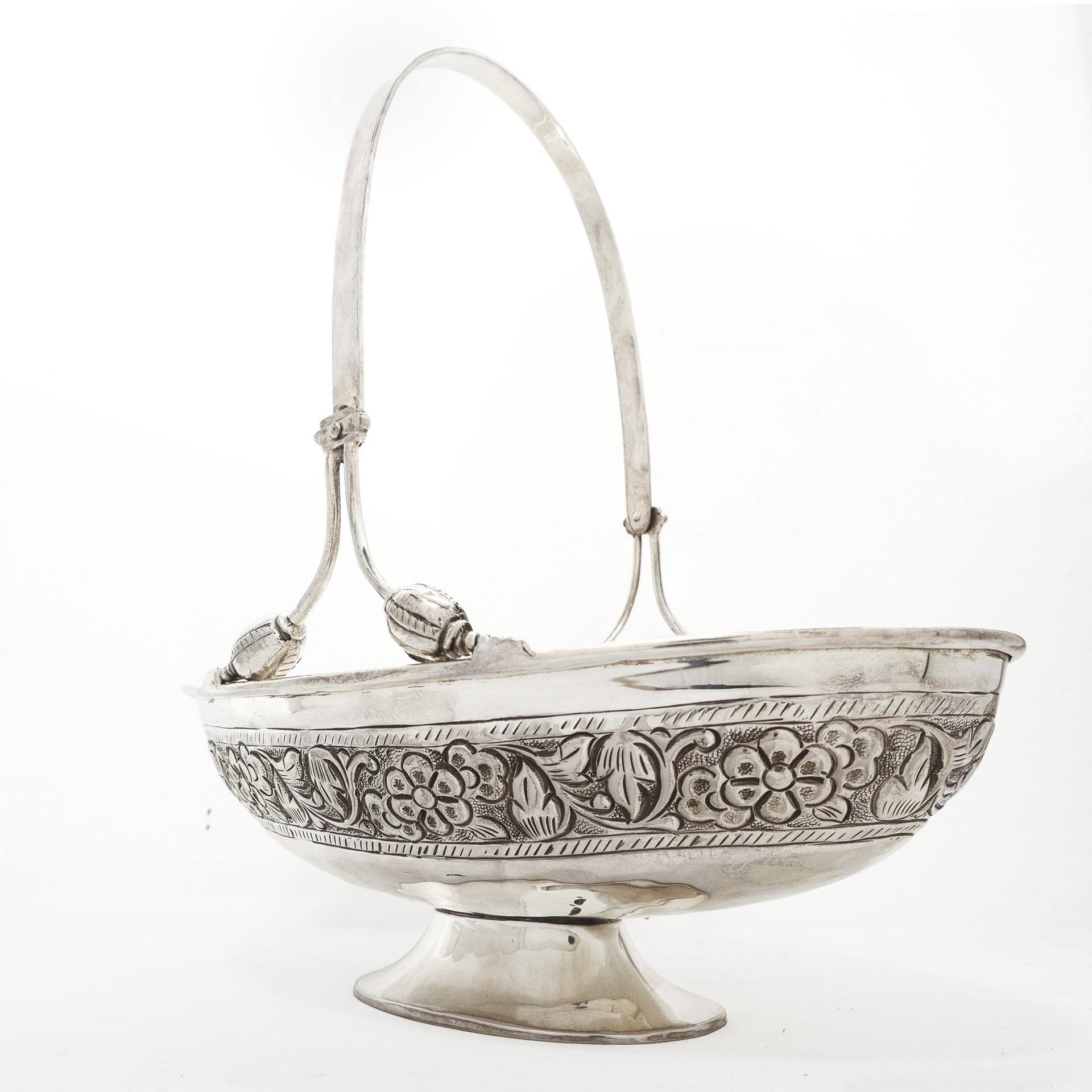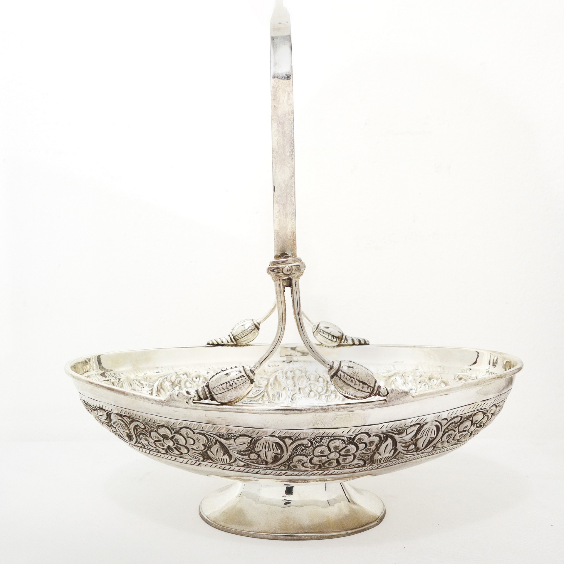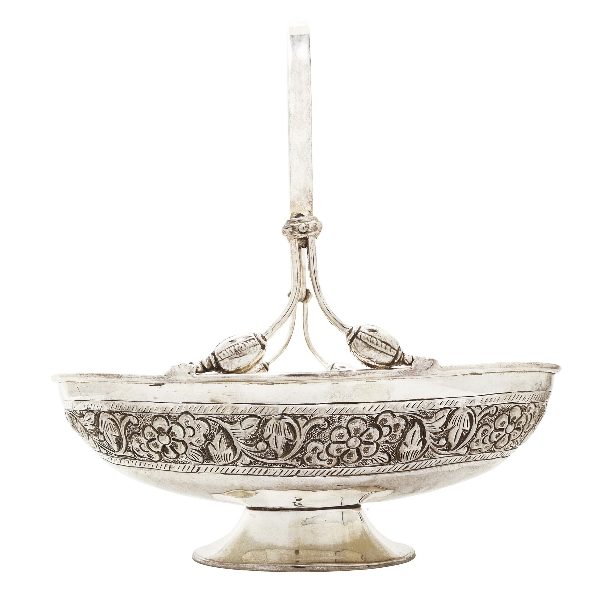 Alzata in Sheffield con manico e decoro a sbalzo h cm 33X31X19 Presente incisione con nome precedente proprietario