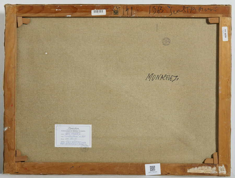 MONACHESI SANTE (1910 - 1991) SCULTOPITTURA. 1963. Tecnica mista e applicazioni su tela. Cm 80,00 x 60,00. sul retro: firma, etichetta e timbro della Galleria d'arte Pinacoteca, Roma